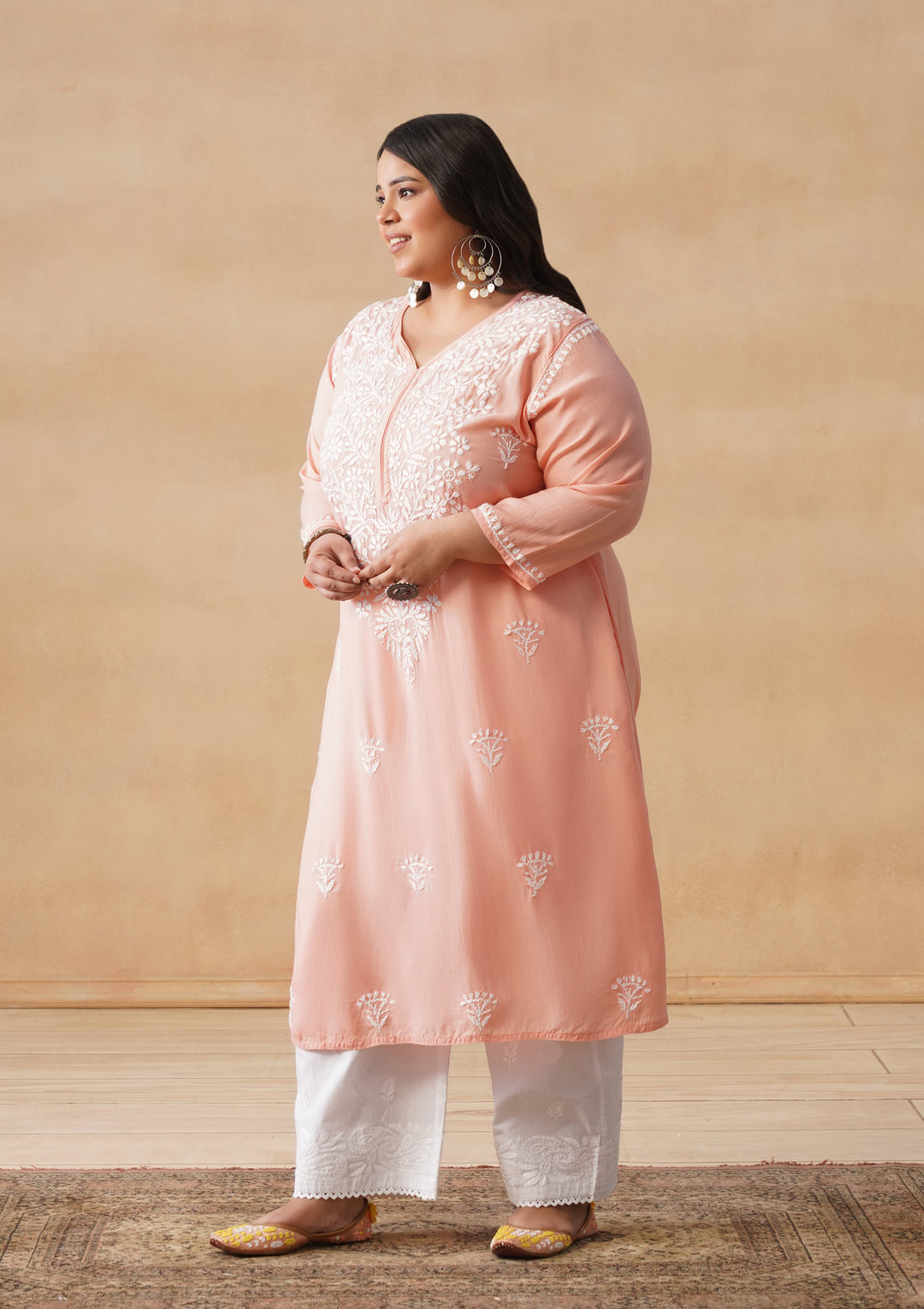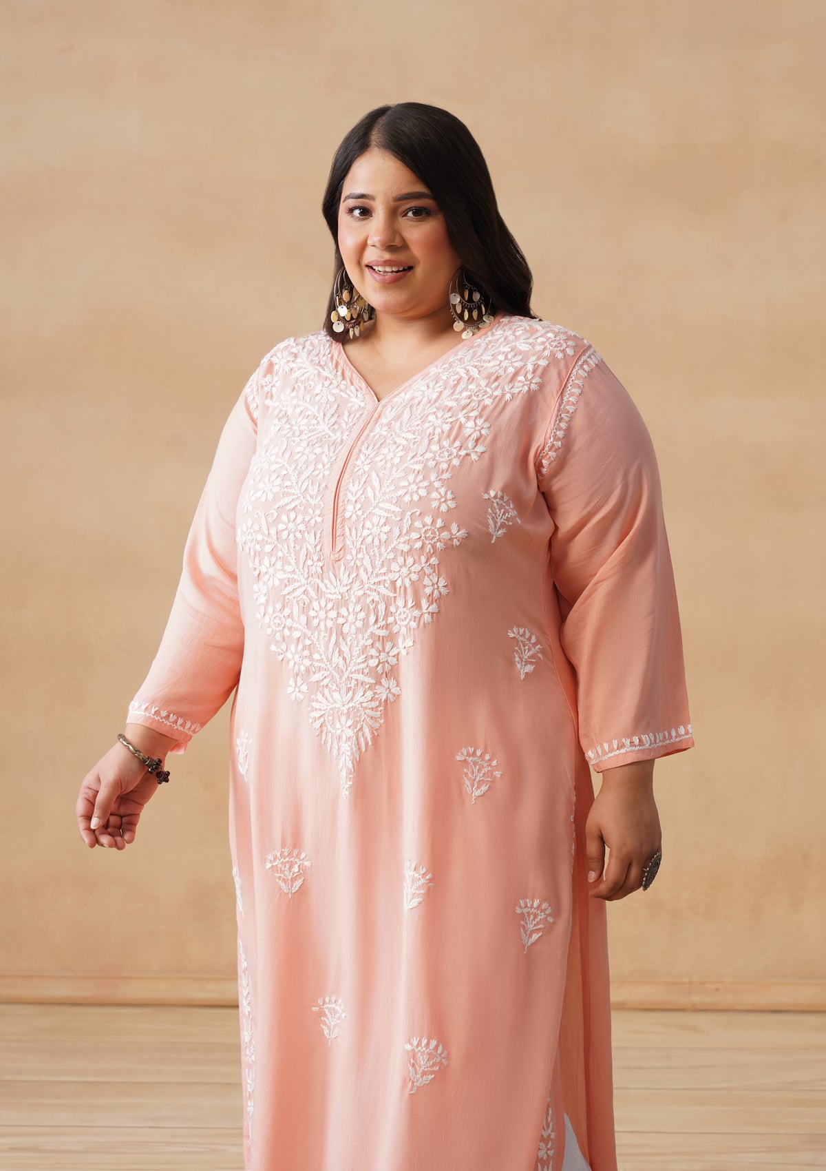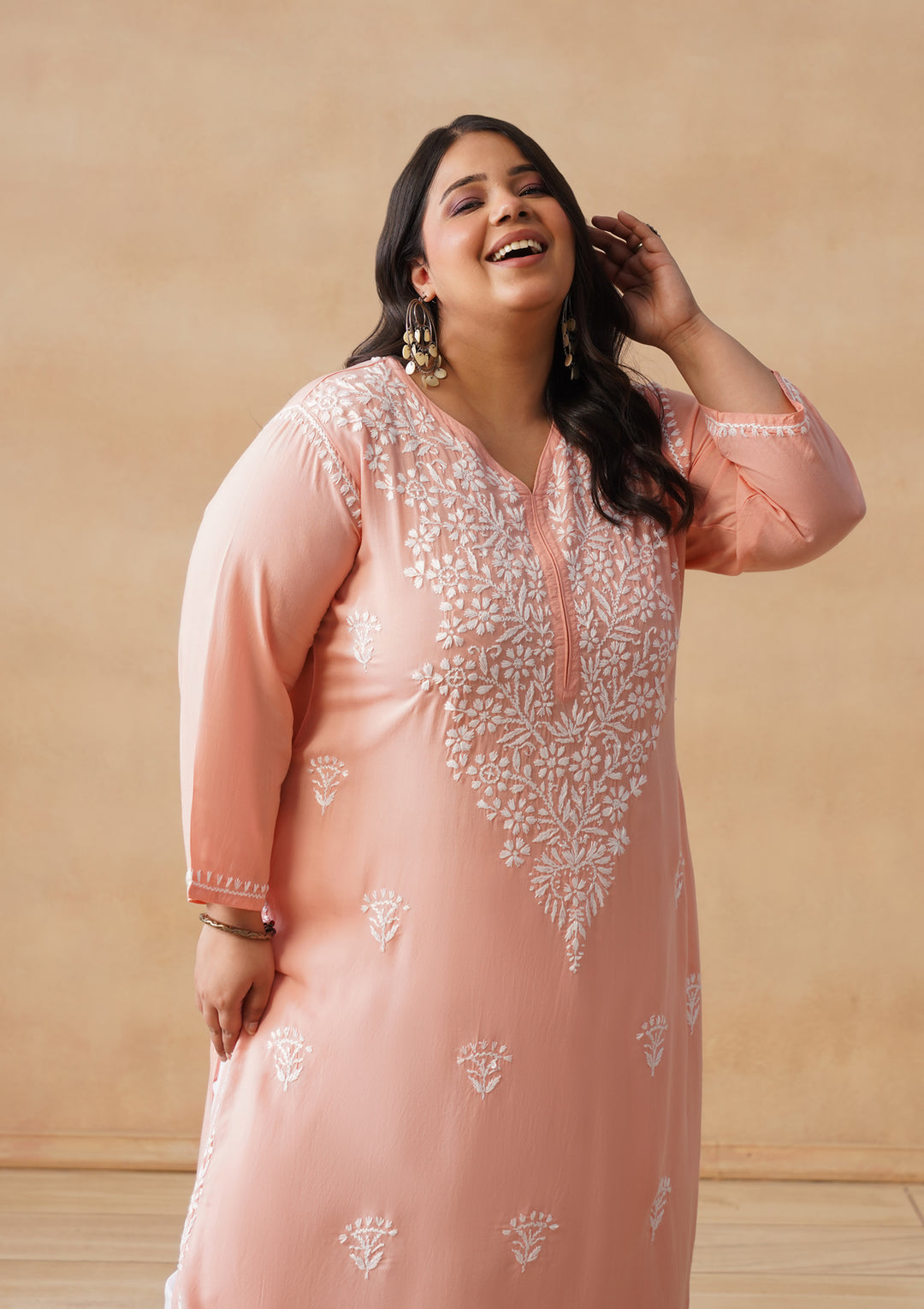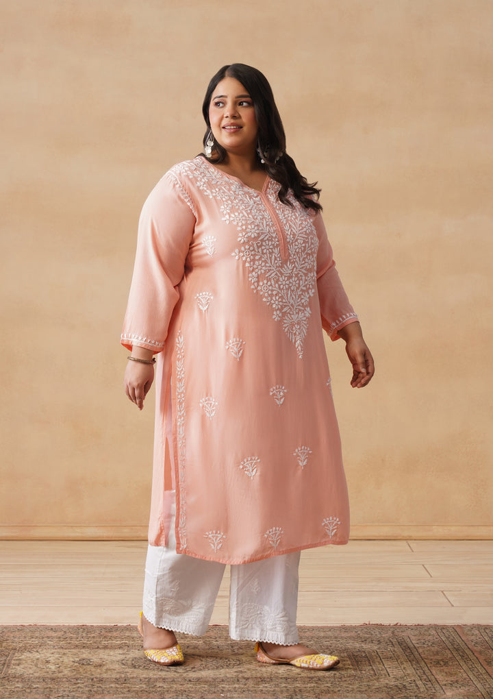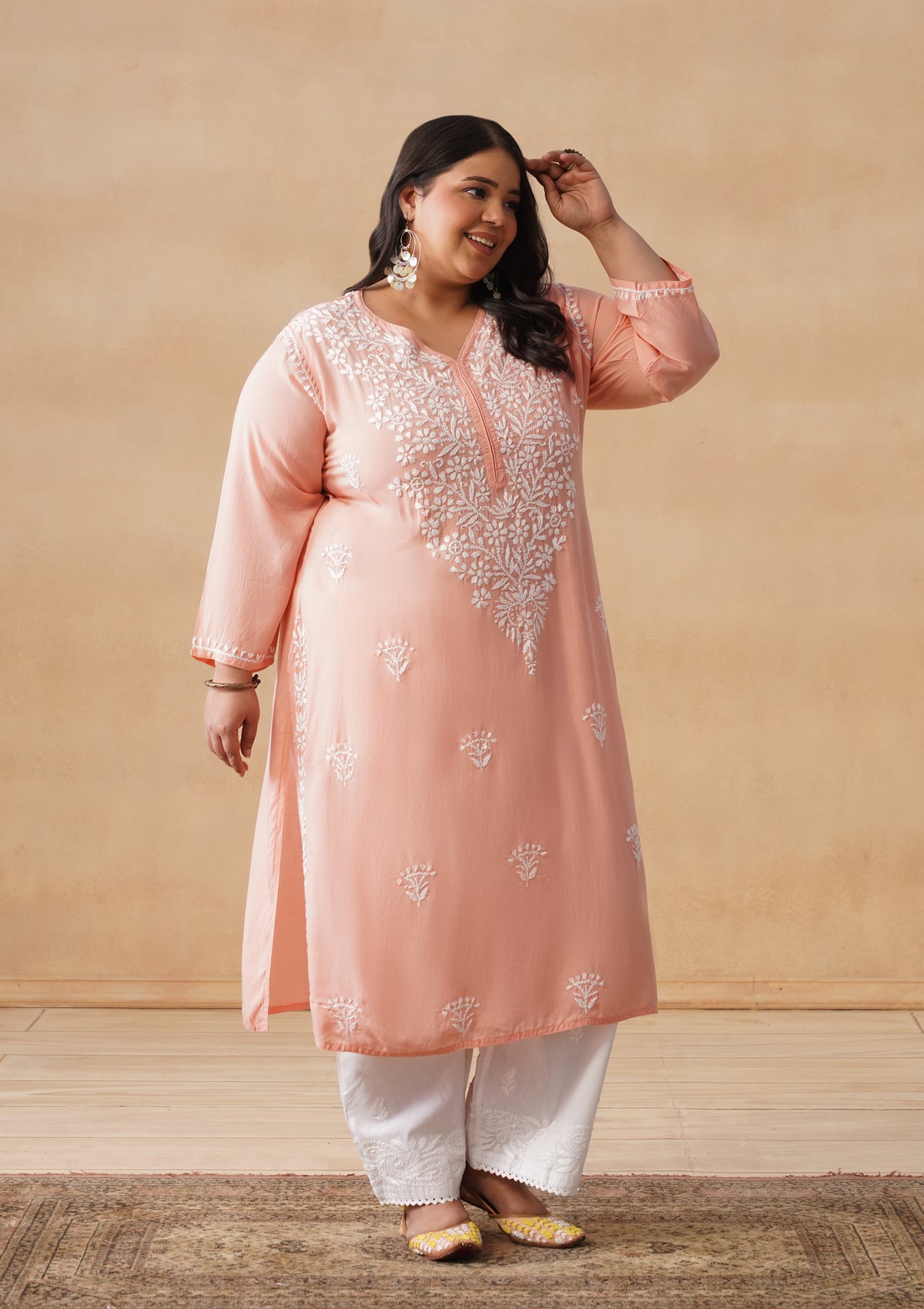 HOC Rayon Chikankari Solid Women's Long Kurta - Peach