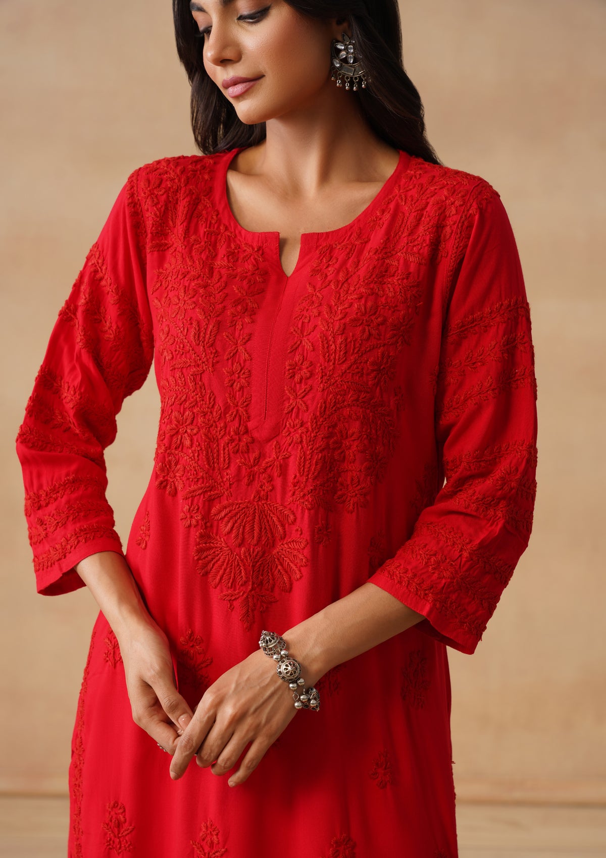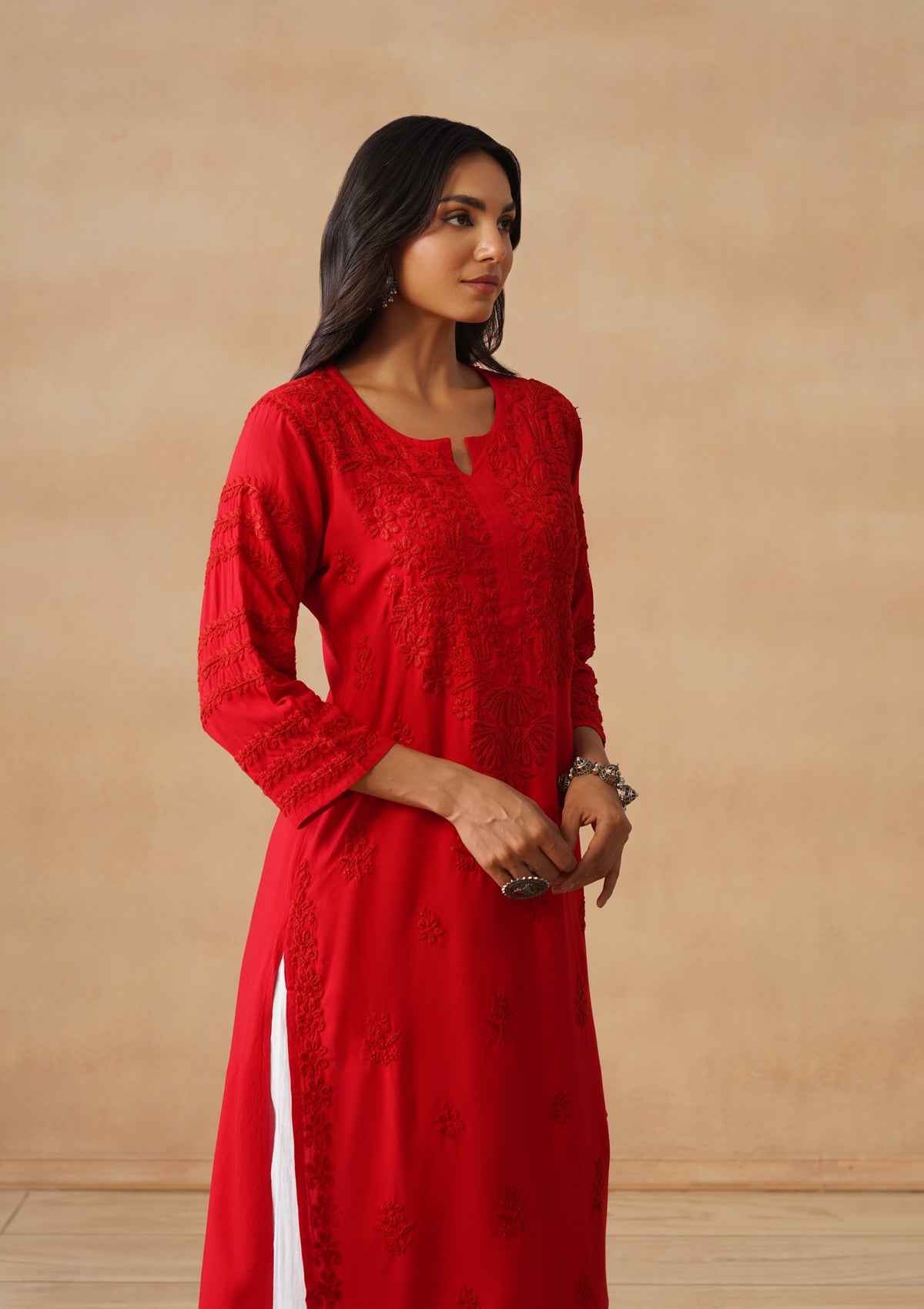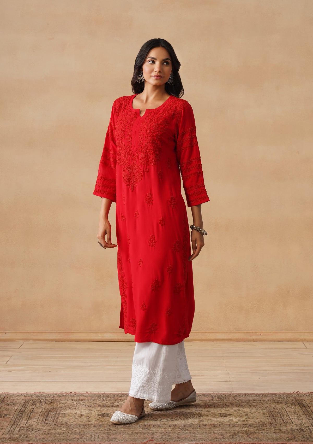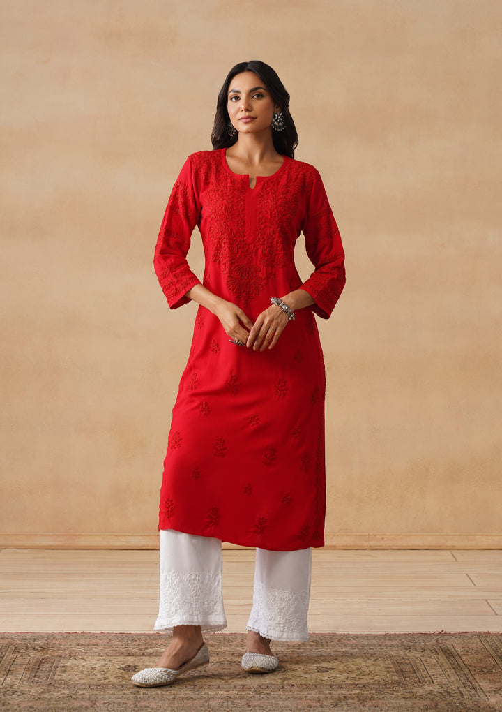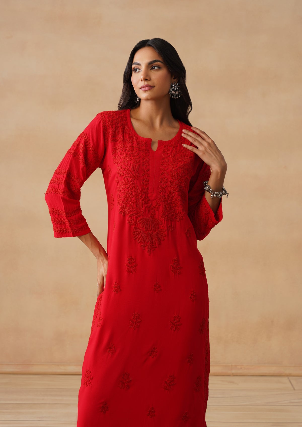 HOC Rayon Chikankari Solid Women's Long Kurta - Red