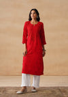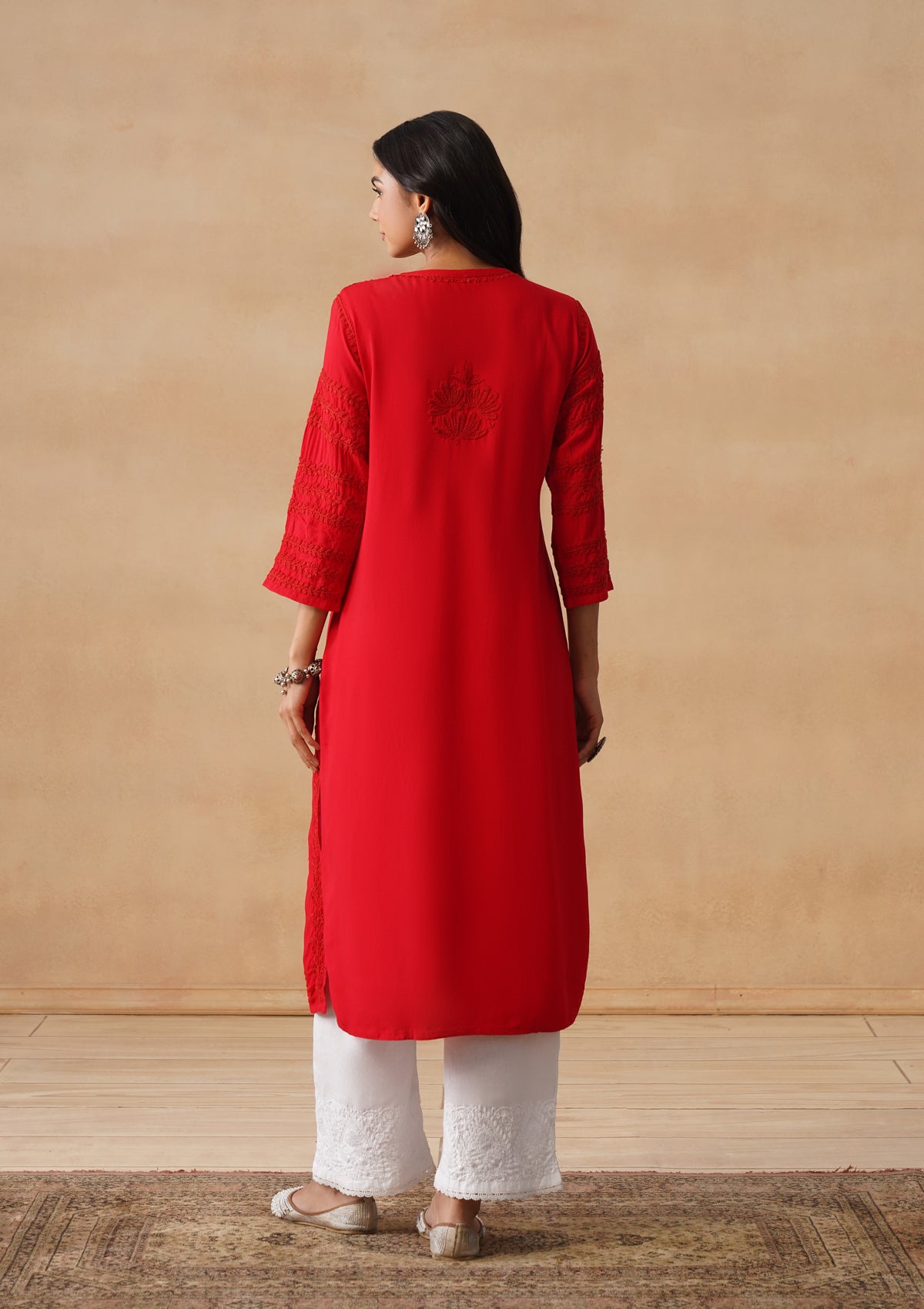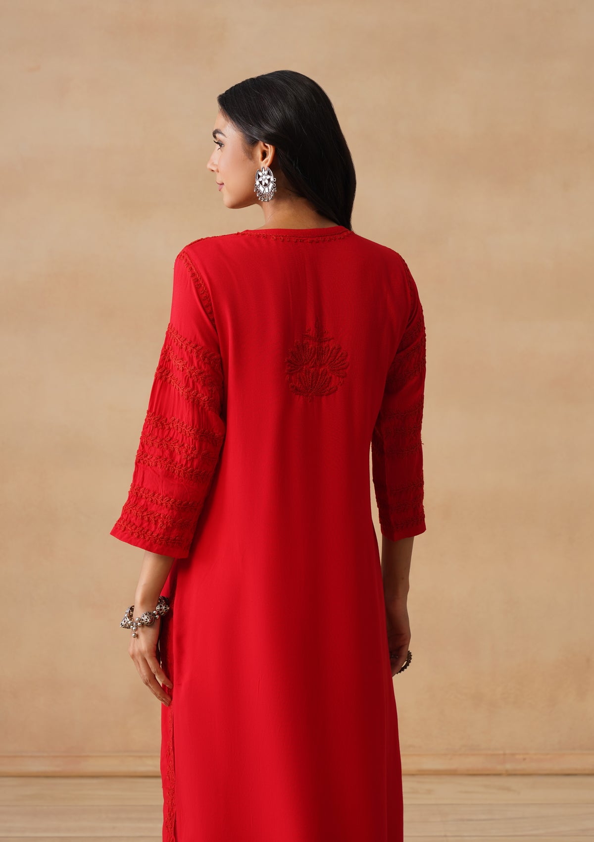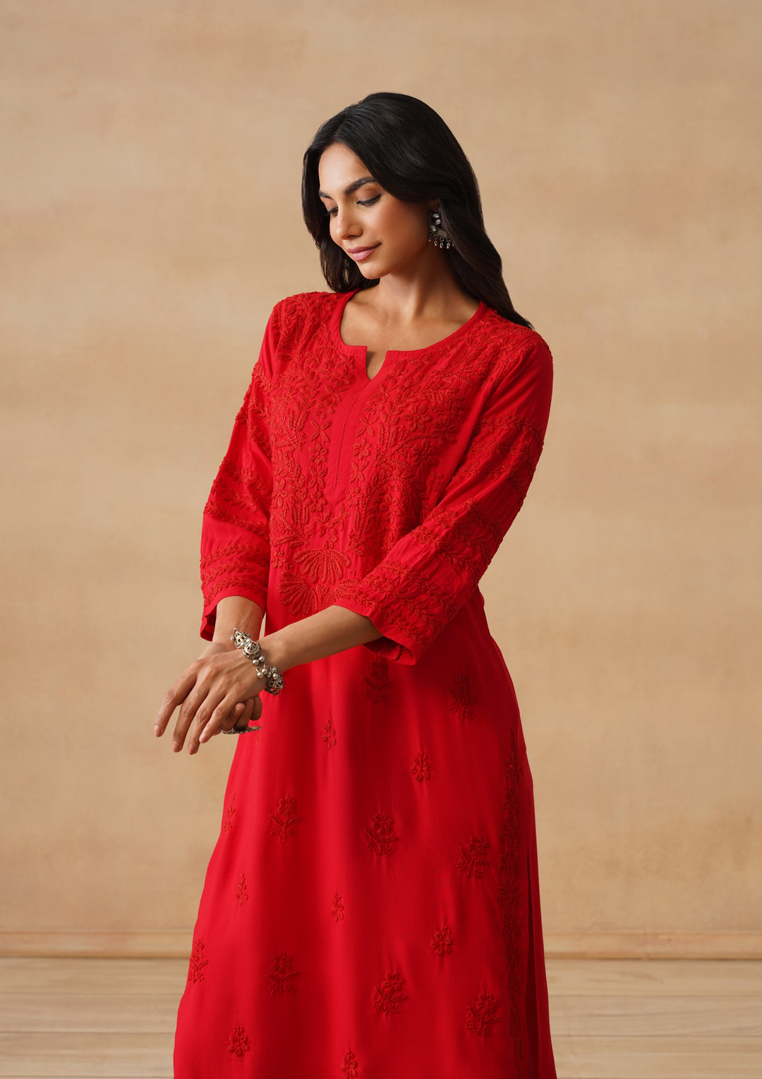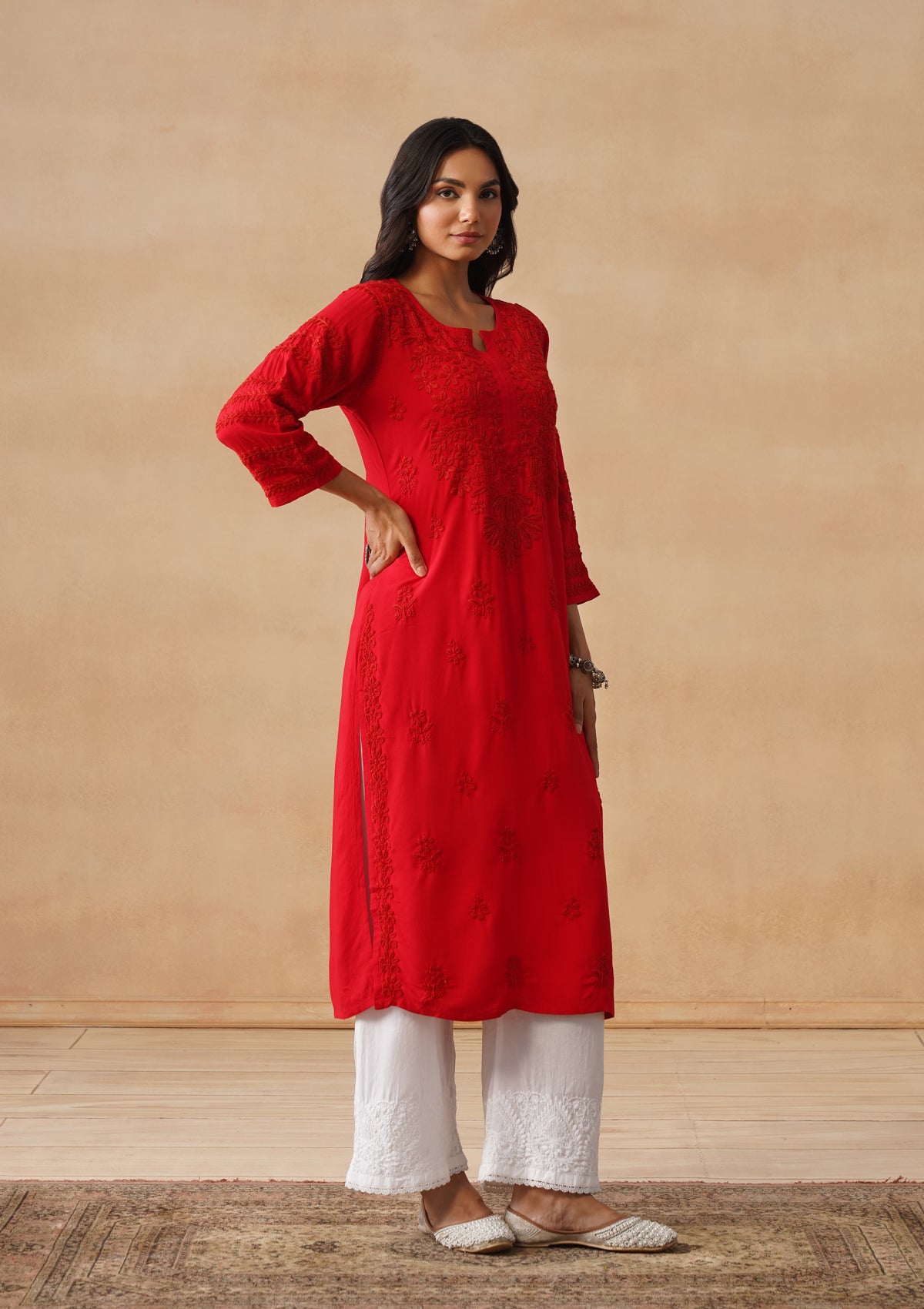 HOC Rayon Chikankari Solid Women's Long Kurta - Red