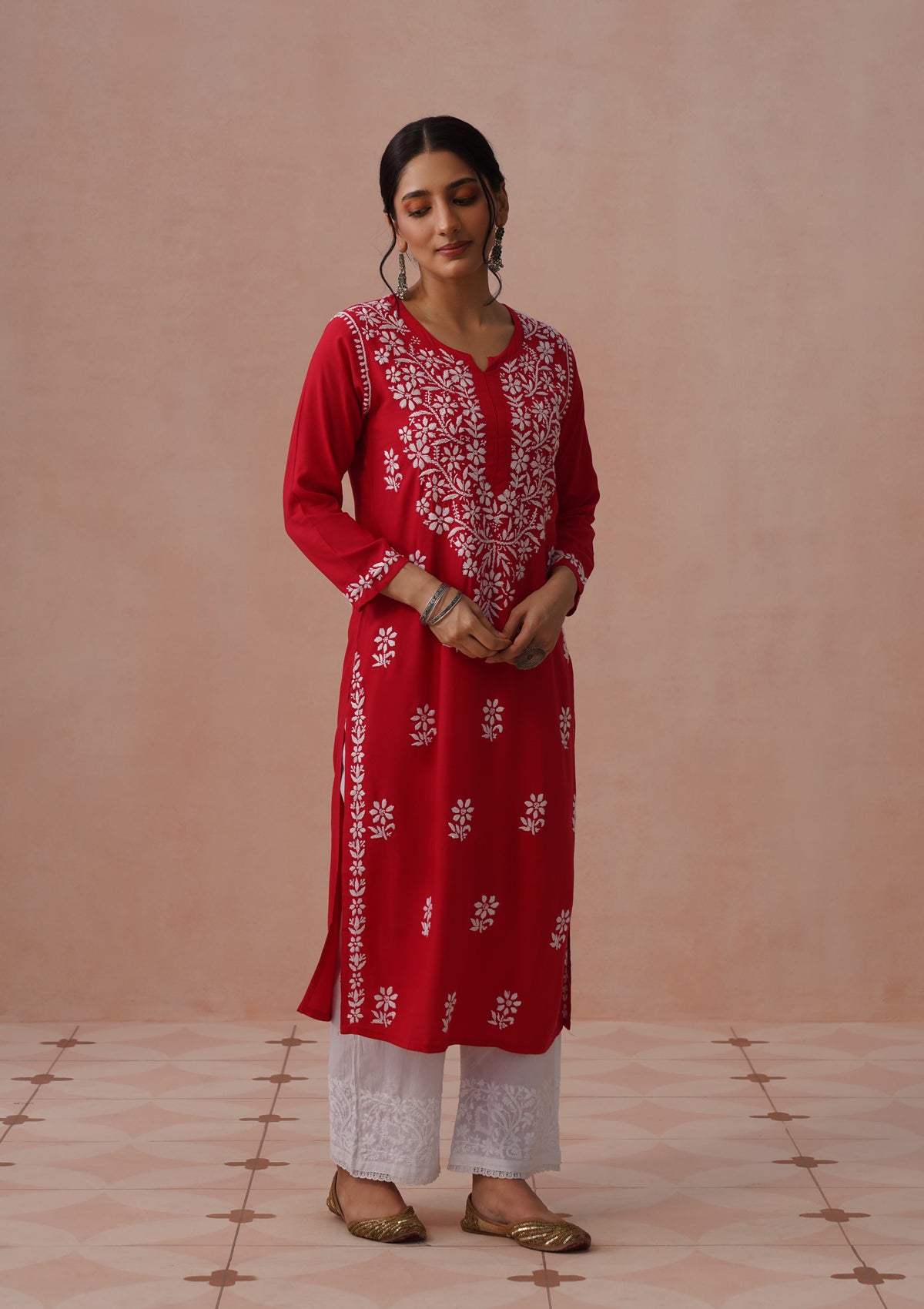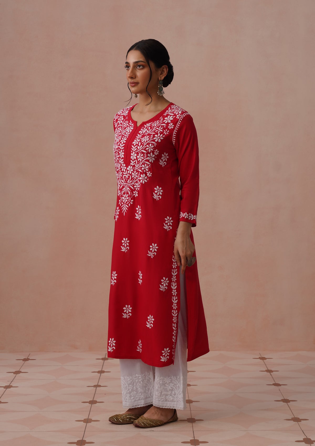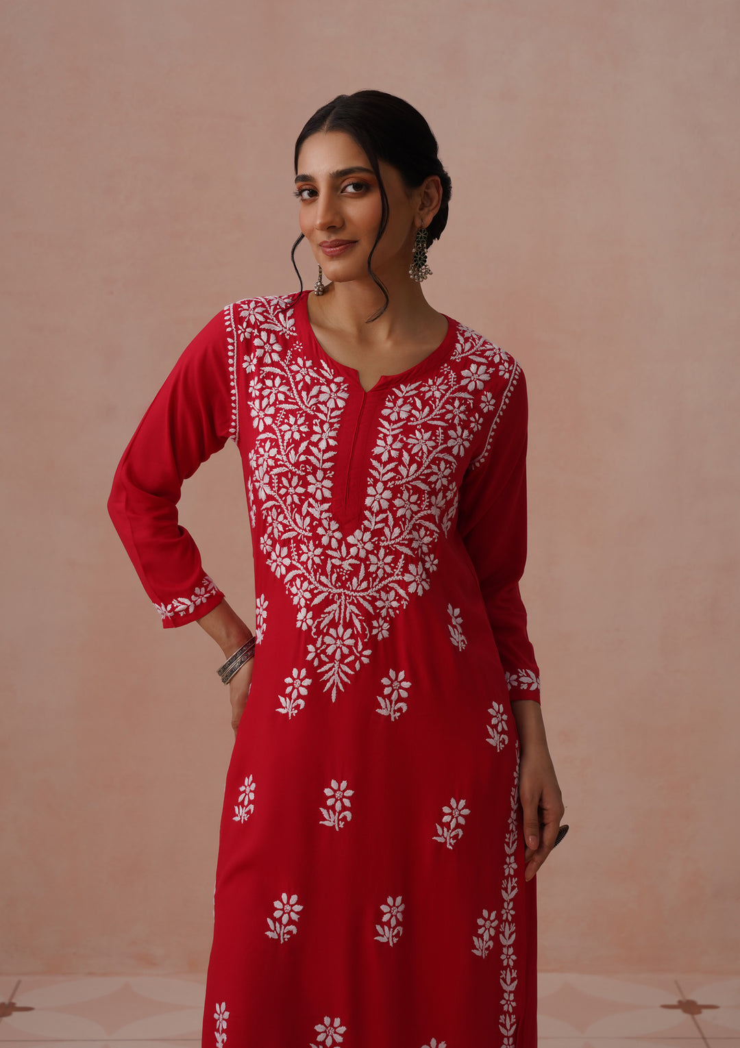 HOC Rayon Chikankari Solid Women's Long Kurta - Red