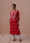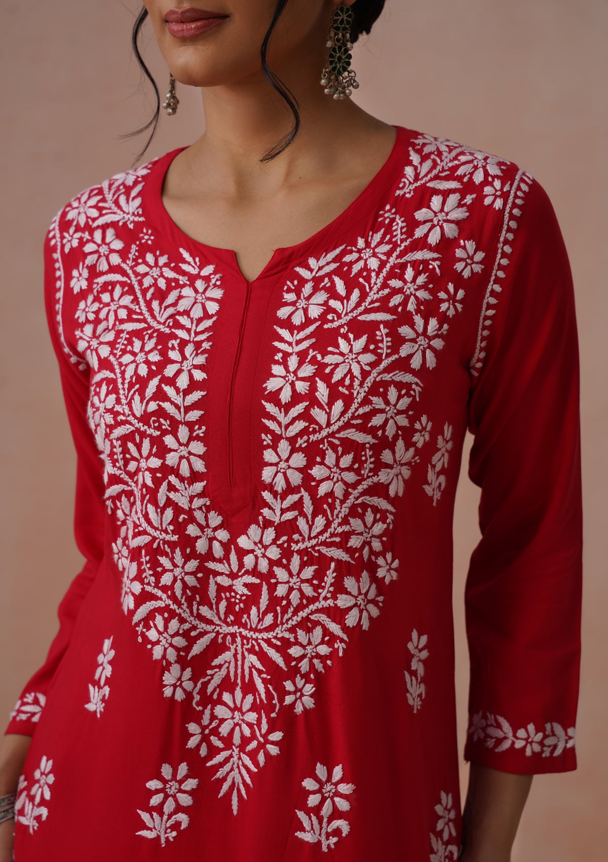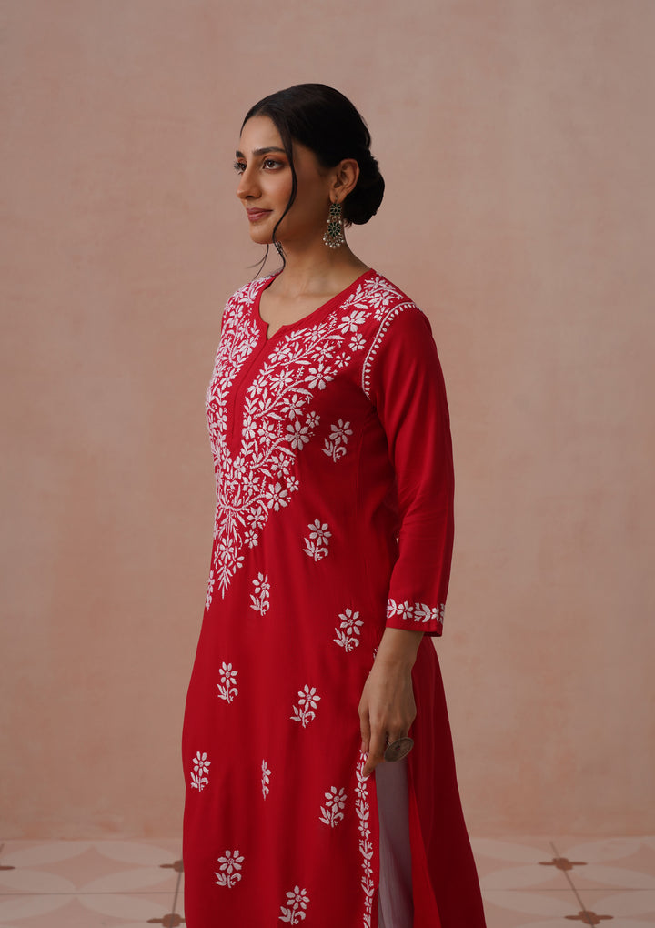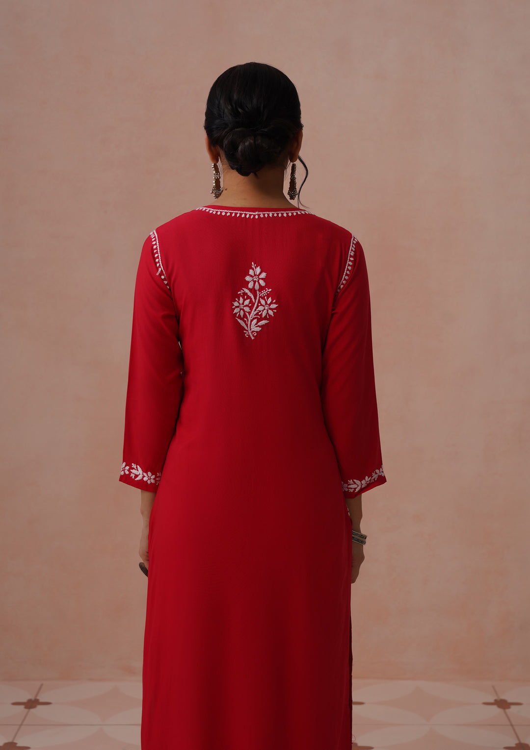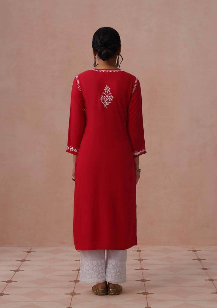 HOC Rayon Chikankari Solid Women's Long Kurta - Red