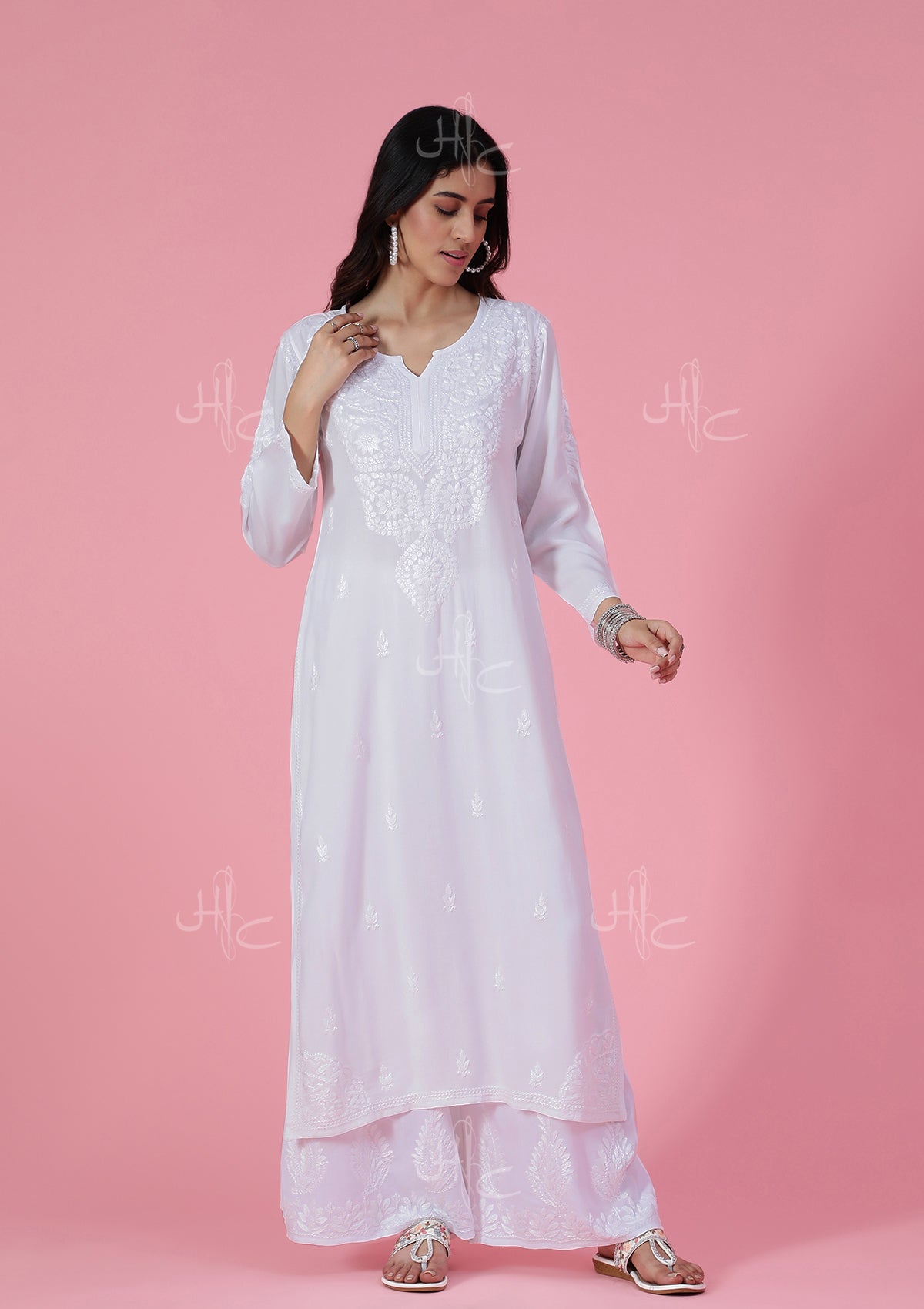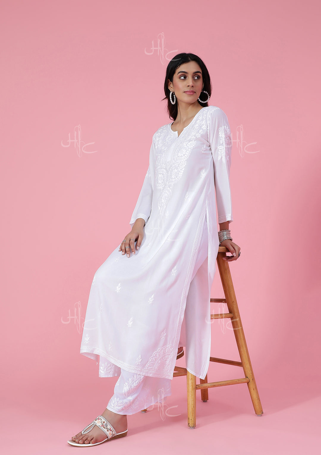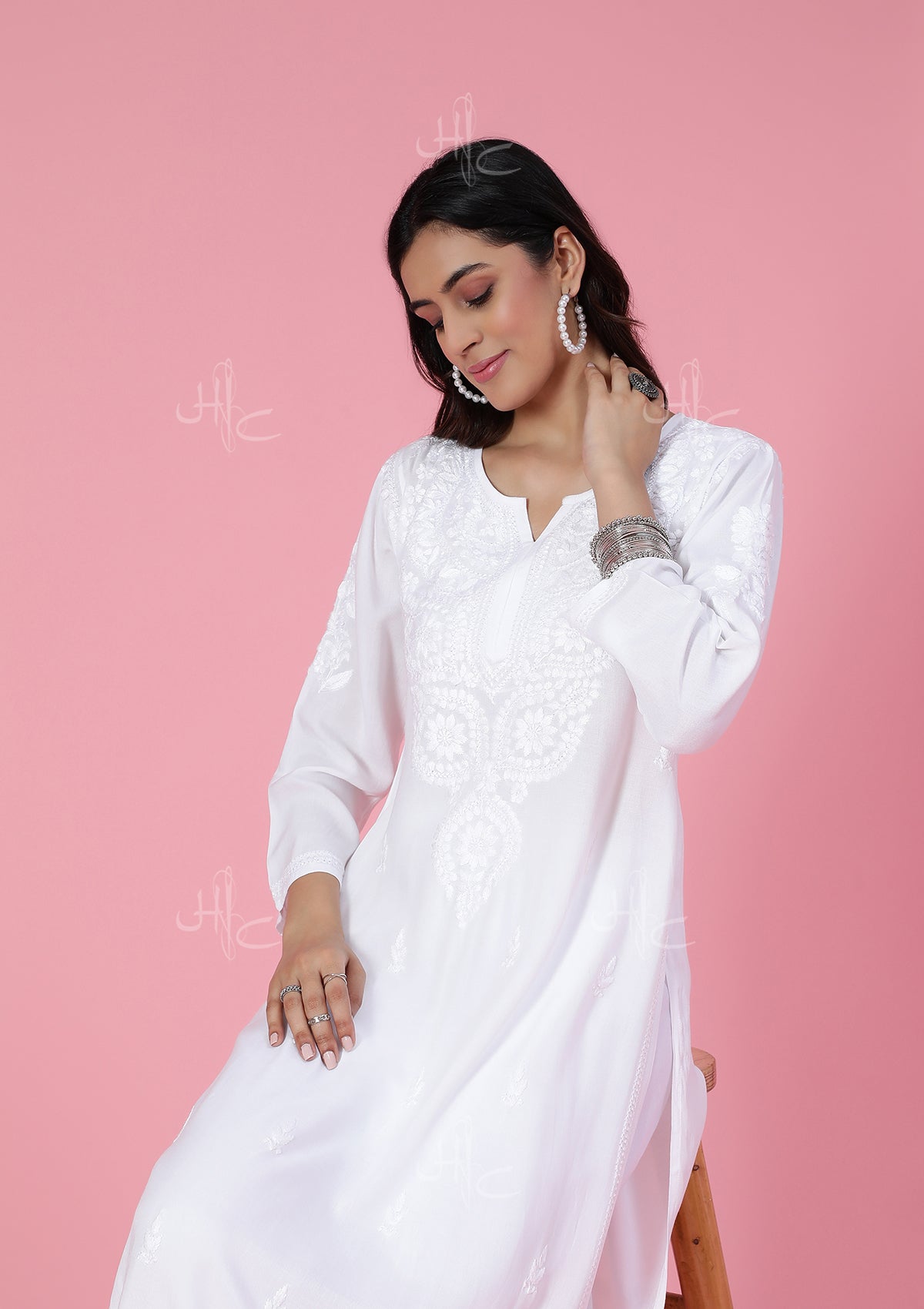 HOC Rayon Chikankari Solid Women's Long Kurta - White