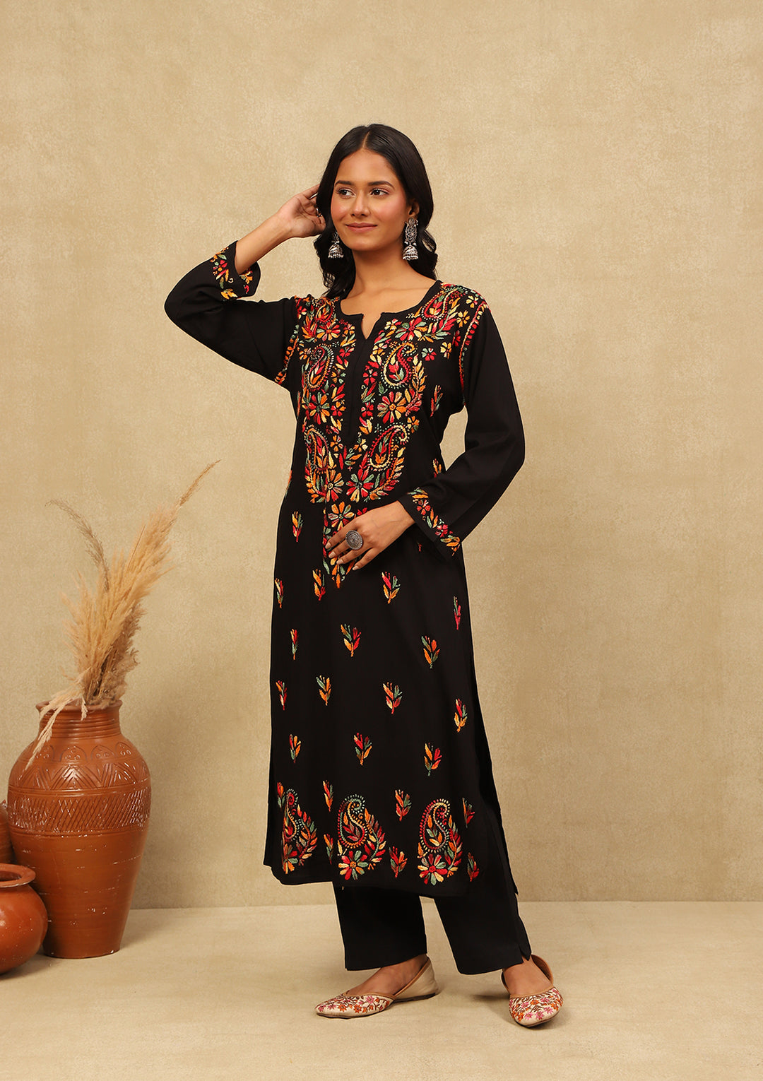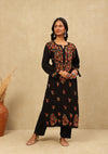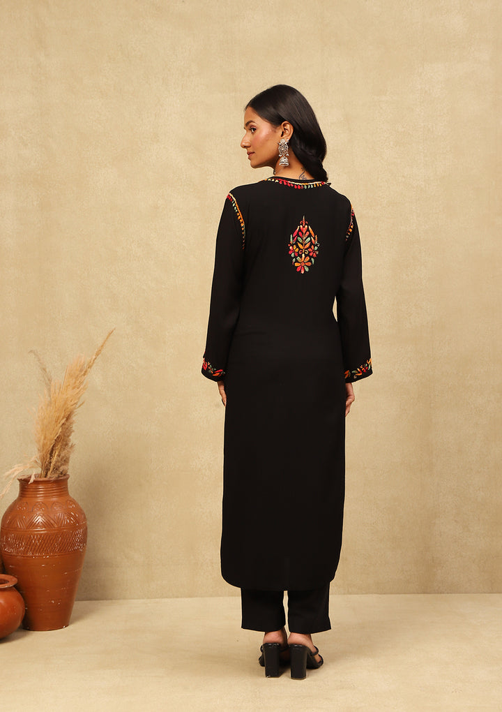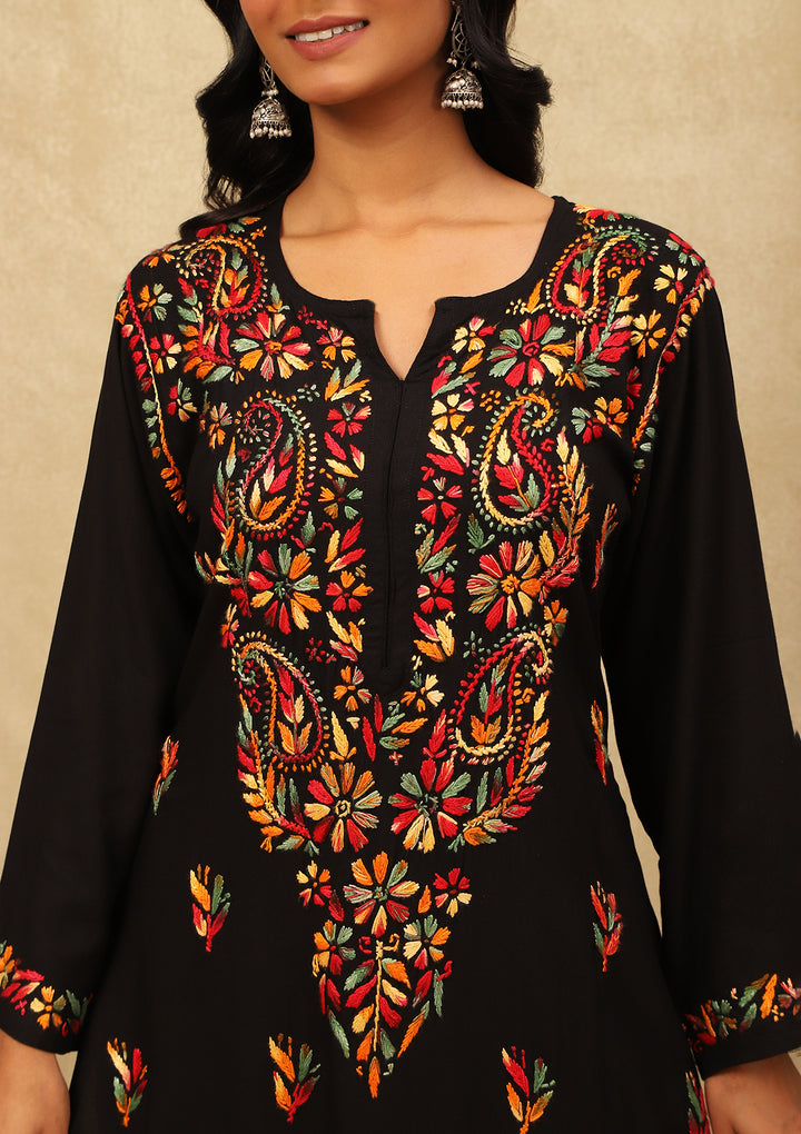 HOC Rayon Chikankari Solid Women's Long Kurta -Black