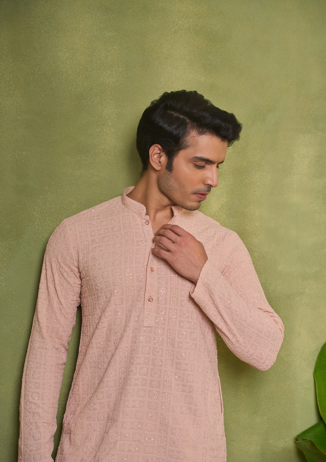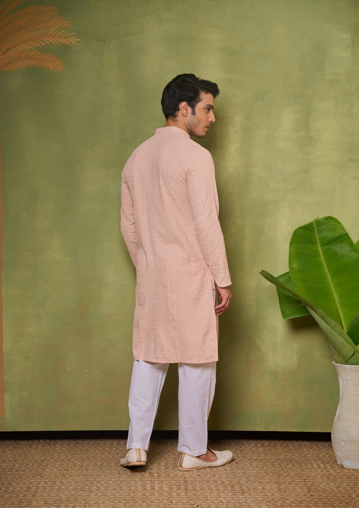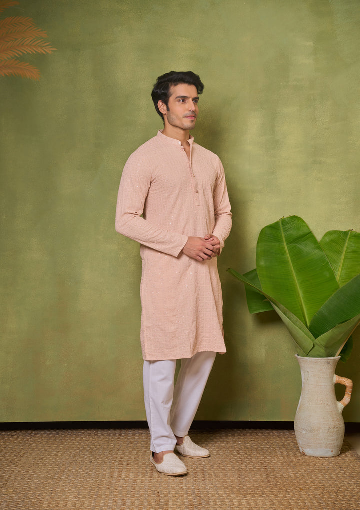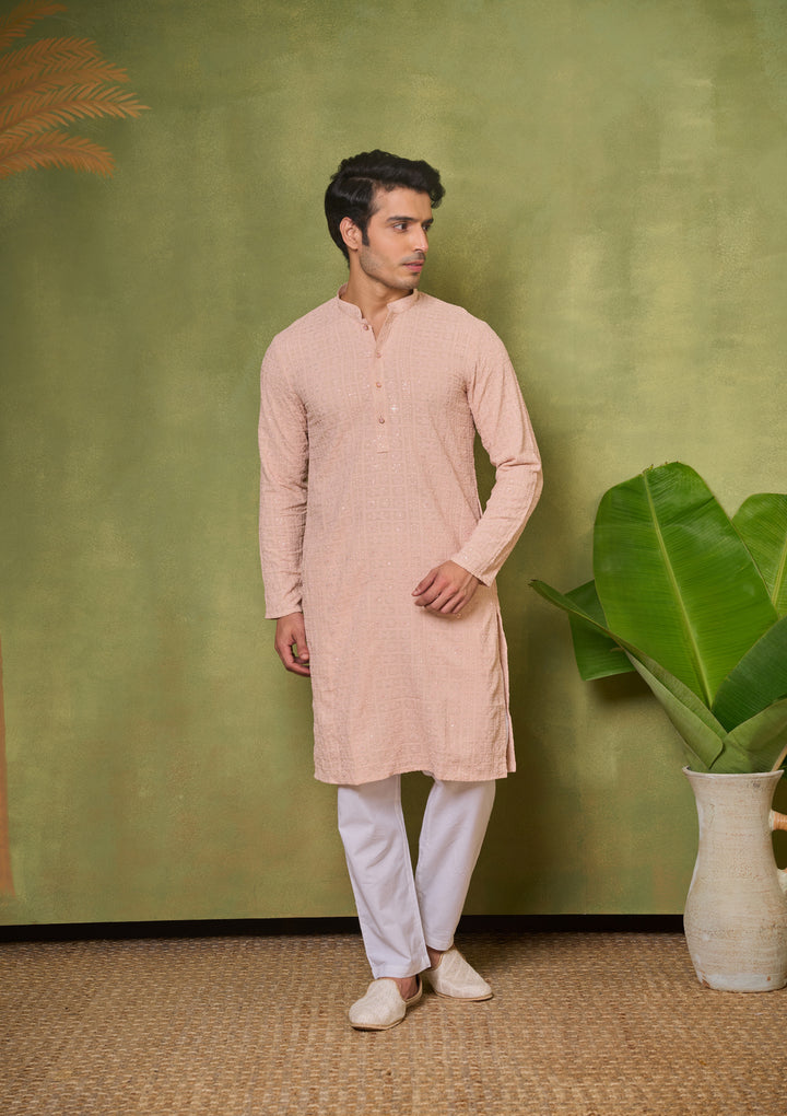HOC Rayon Embroidered With Sequins Solid Men's Long Kurta- Peach