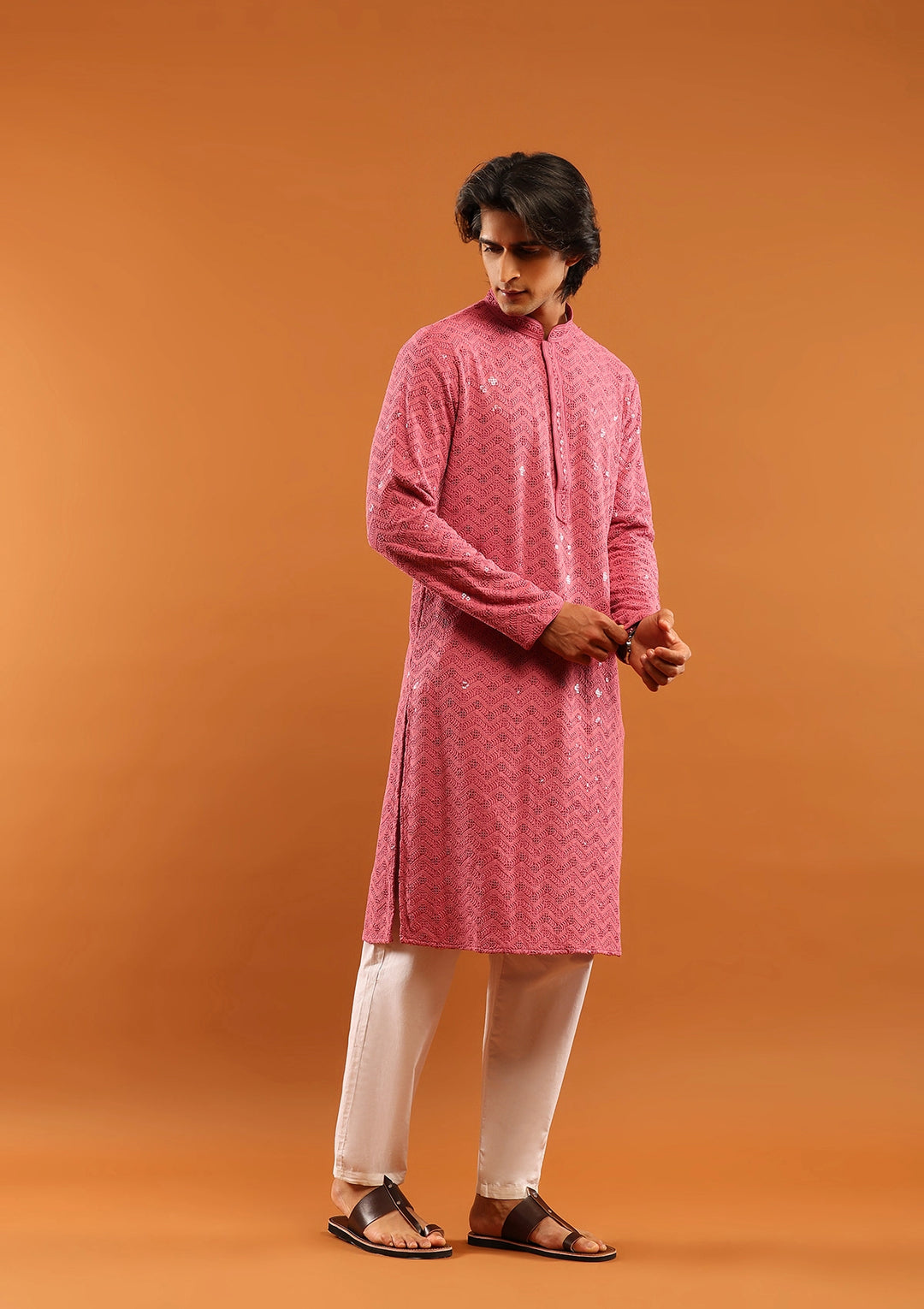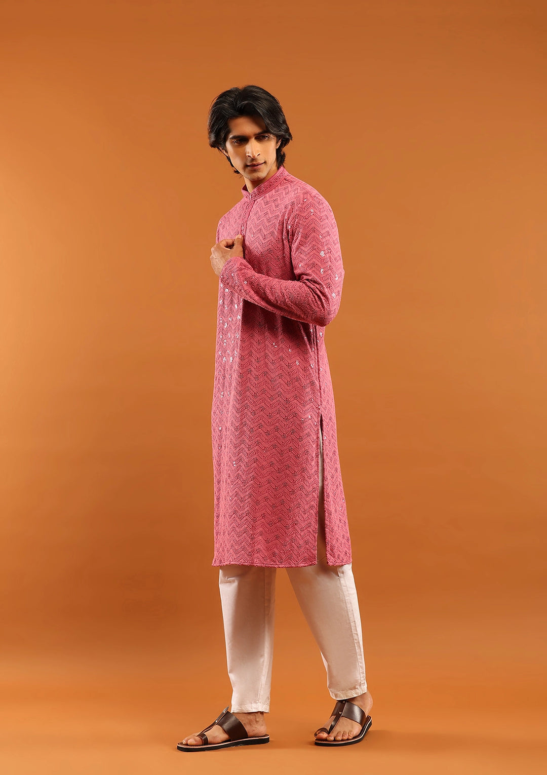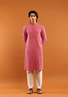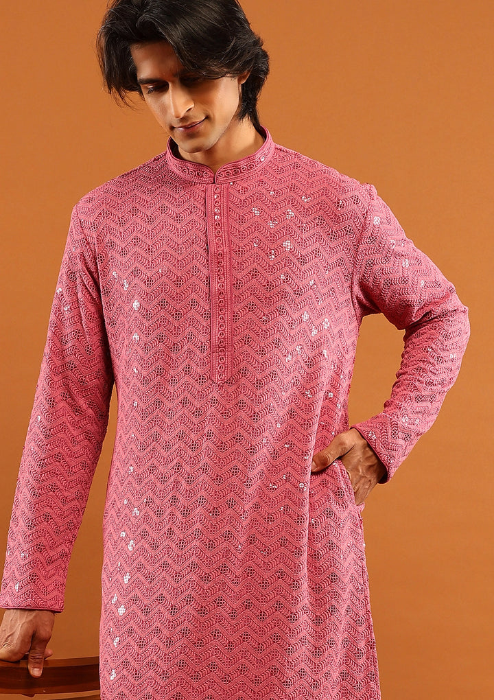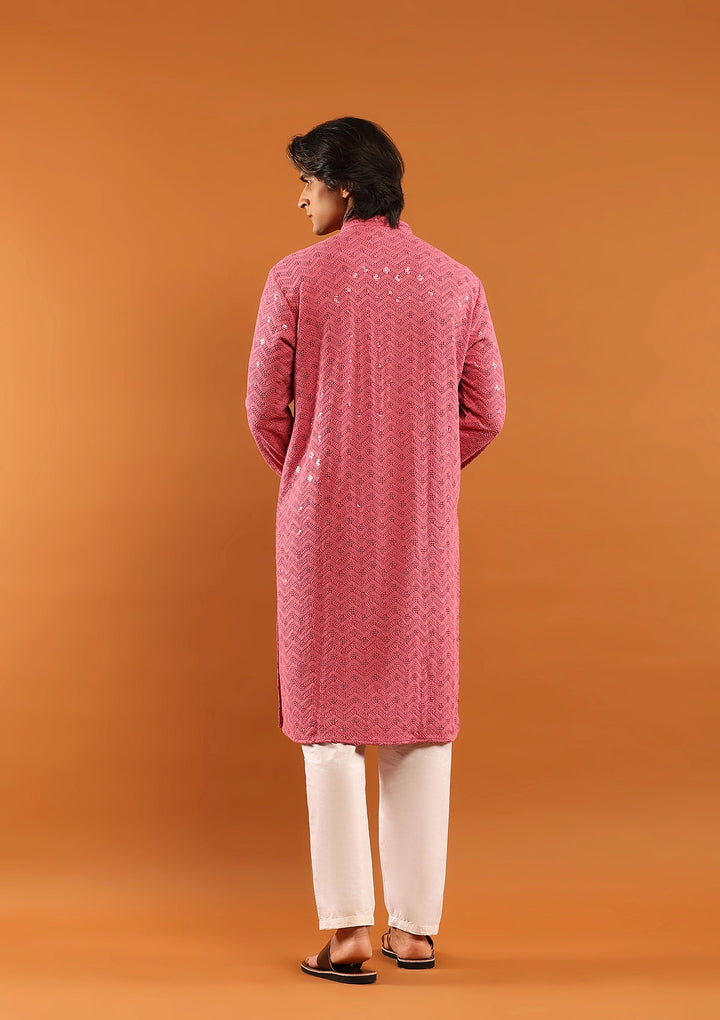 HOC Rayon Embroidered With Sequins Solid Men's Long Kurta- Pink