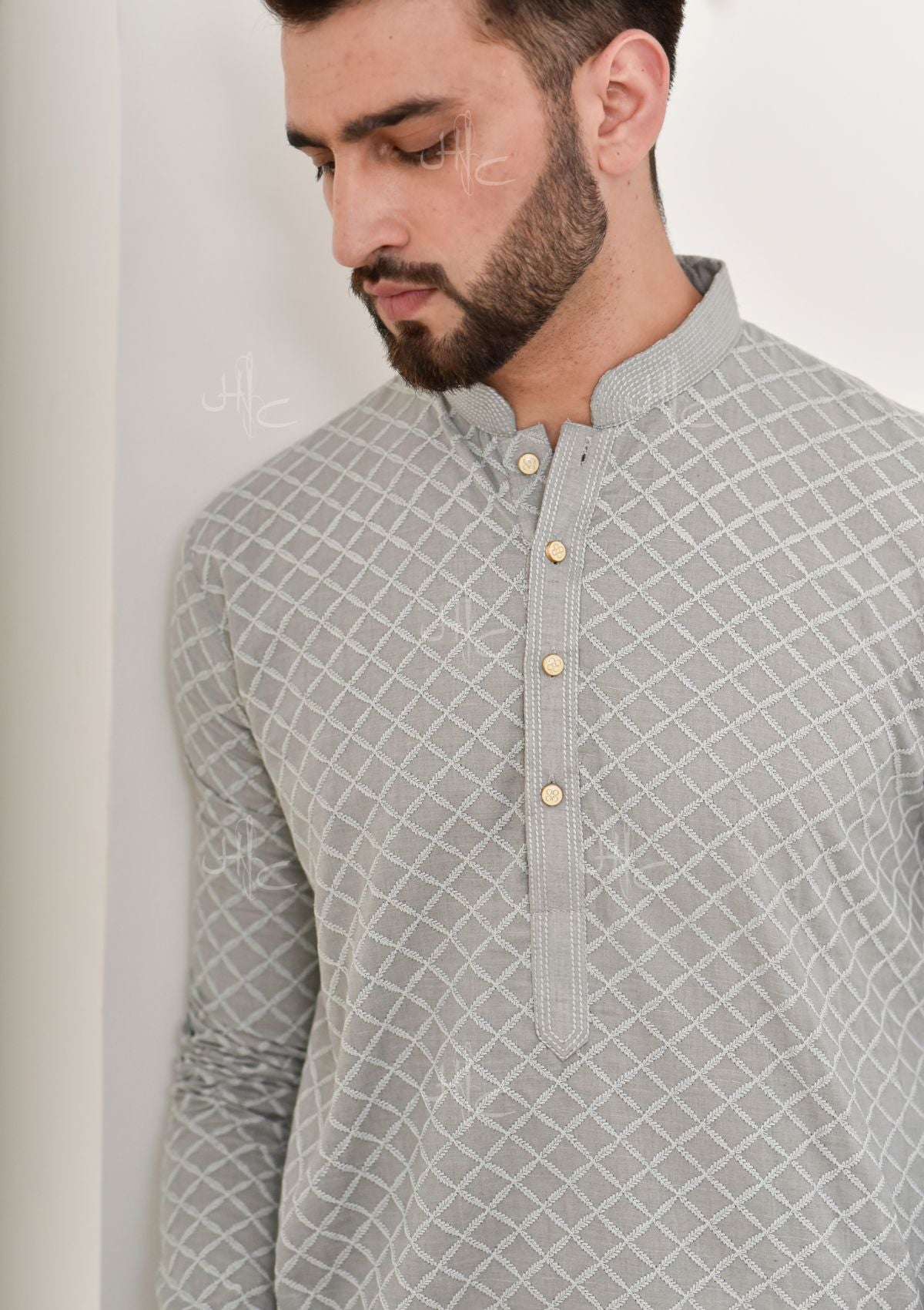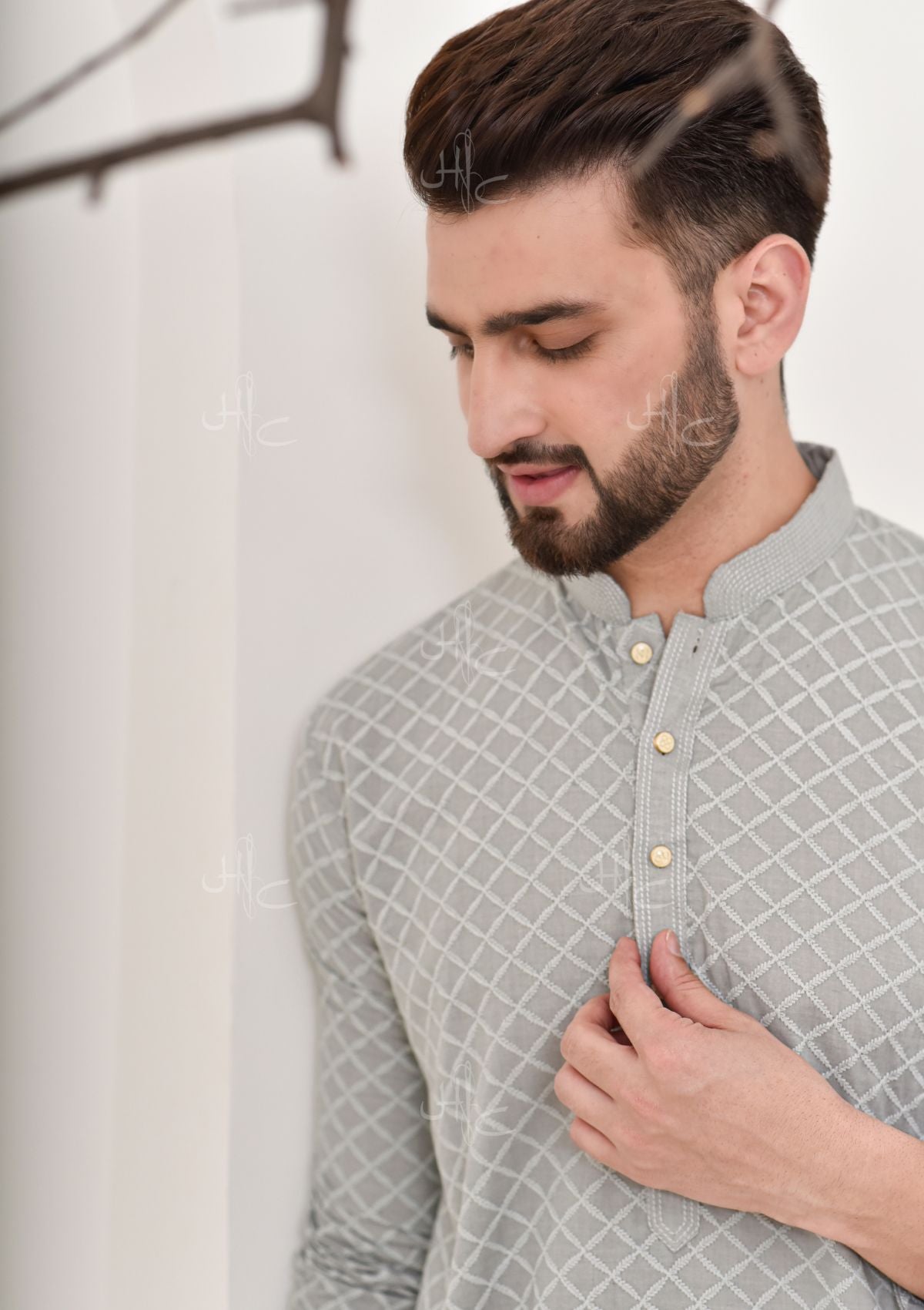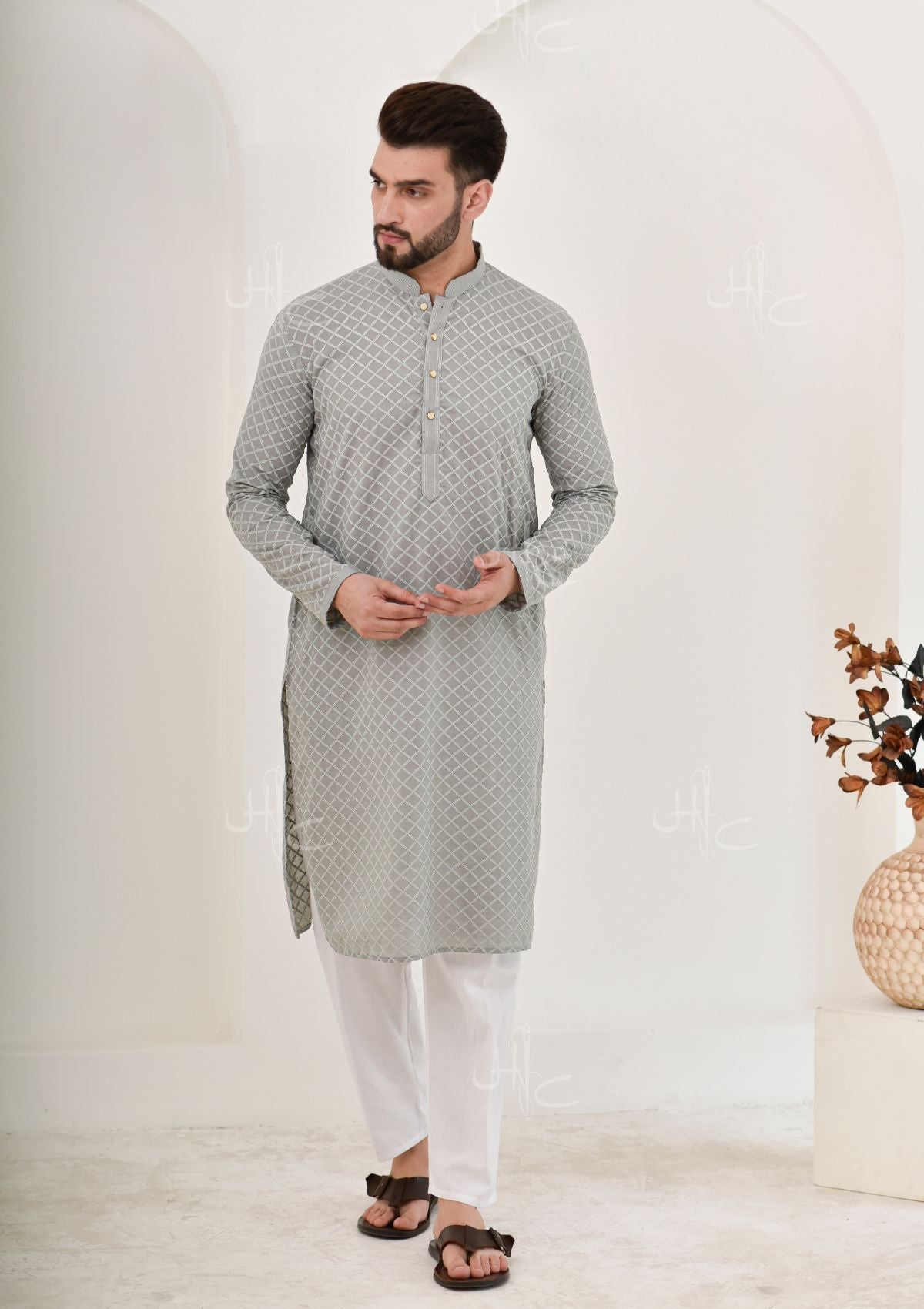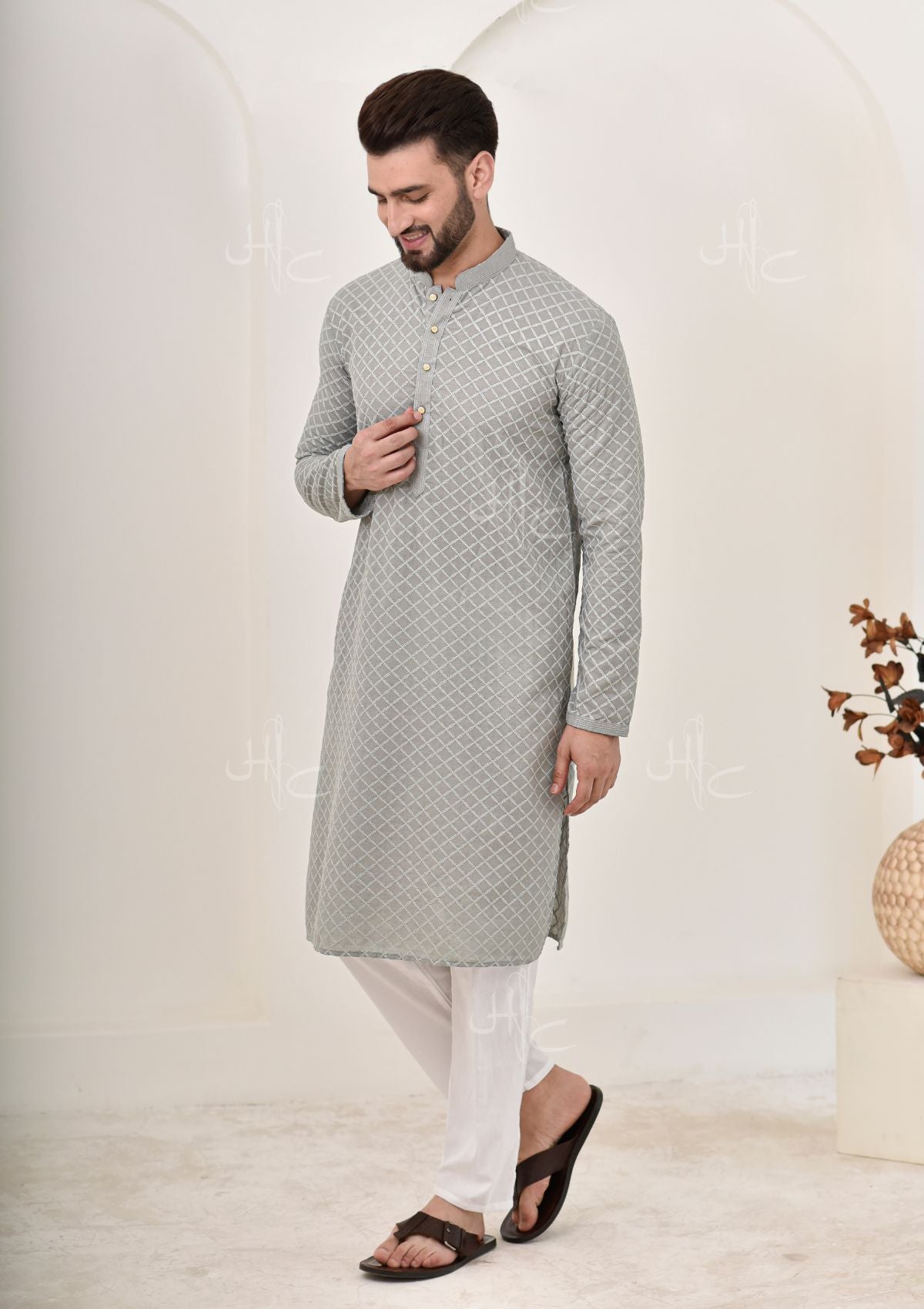 HOC Rayon Embroidered With Sequins Solid Men's Long Kurta- Light Grey