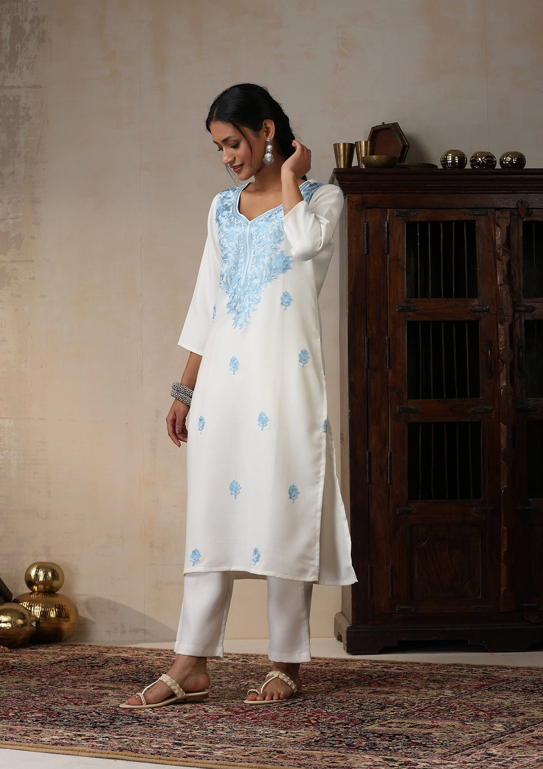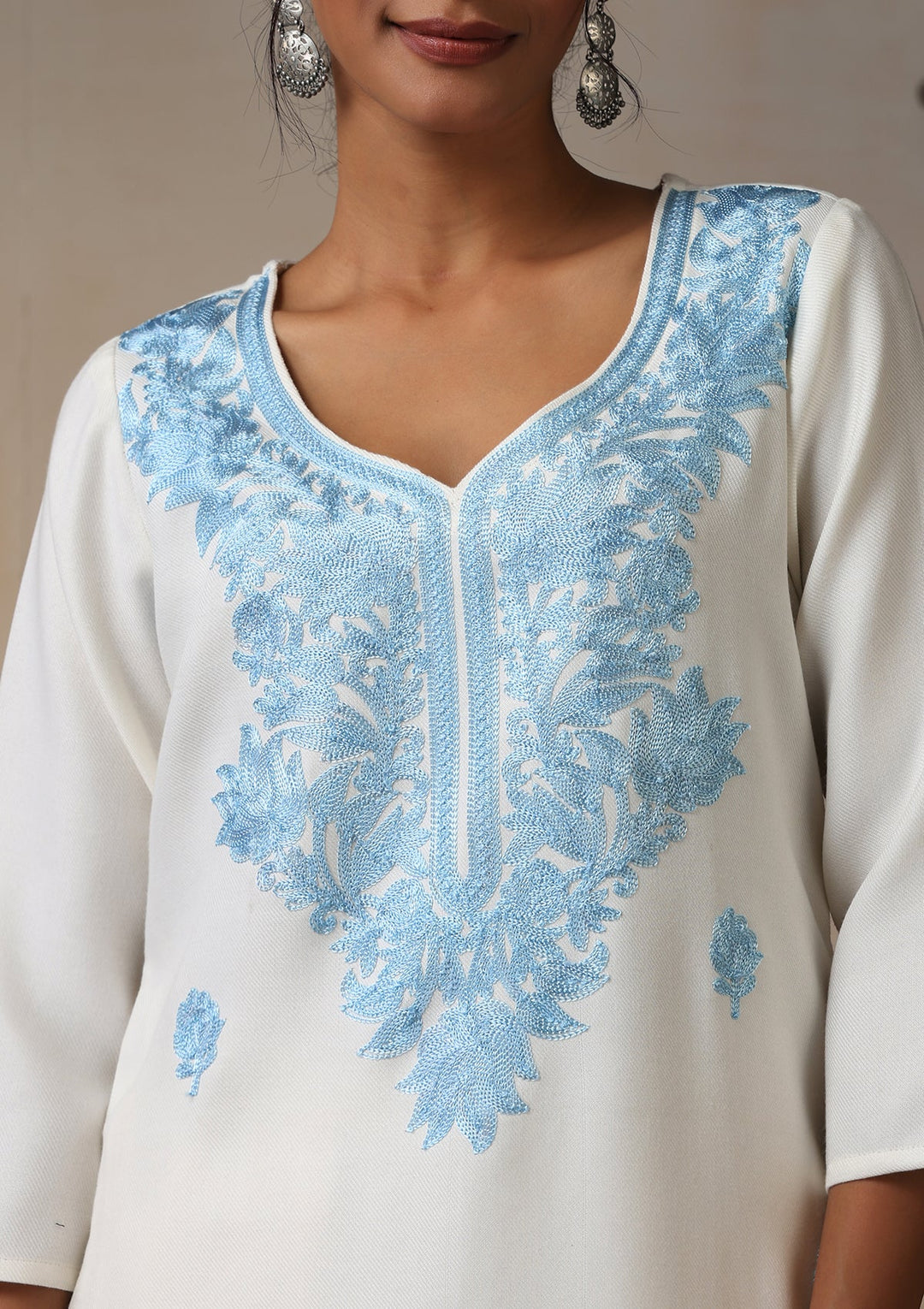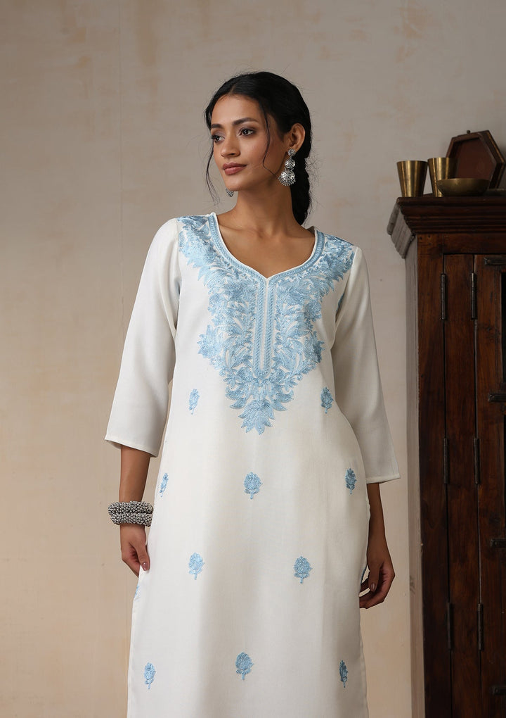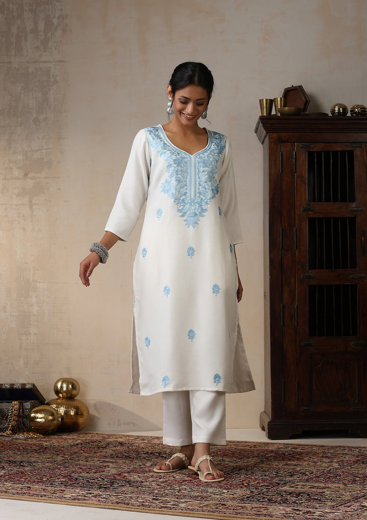 HOC Wool Aari Embroidered Solid Women's 2 Pc Long Kurta Set - White