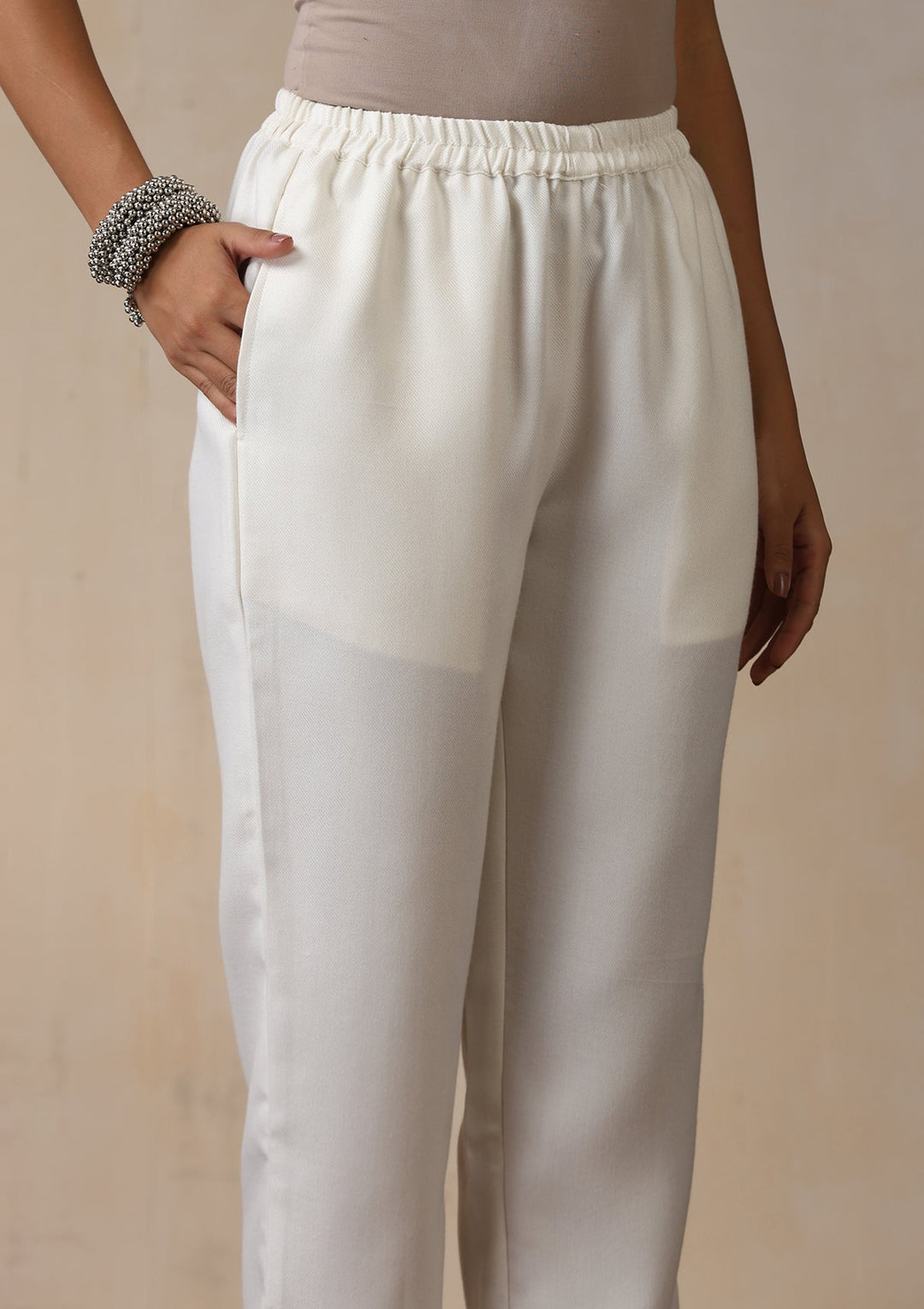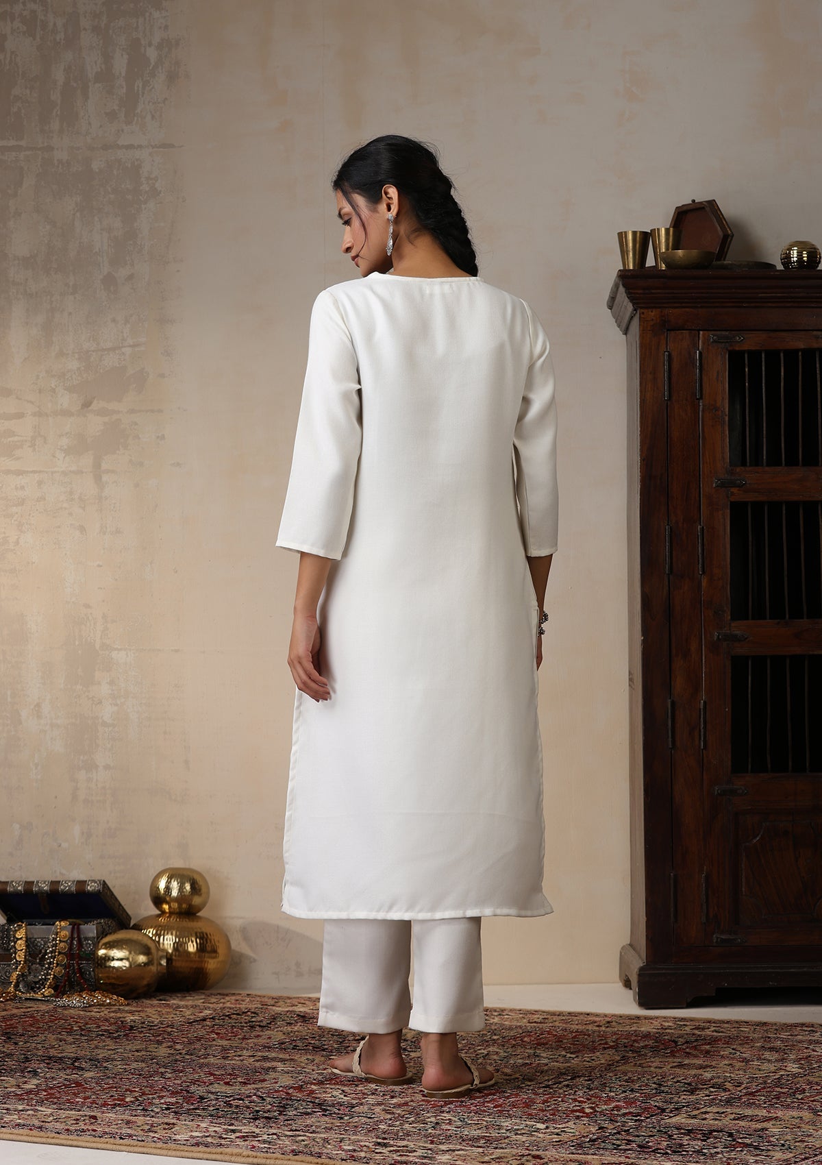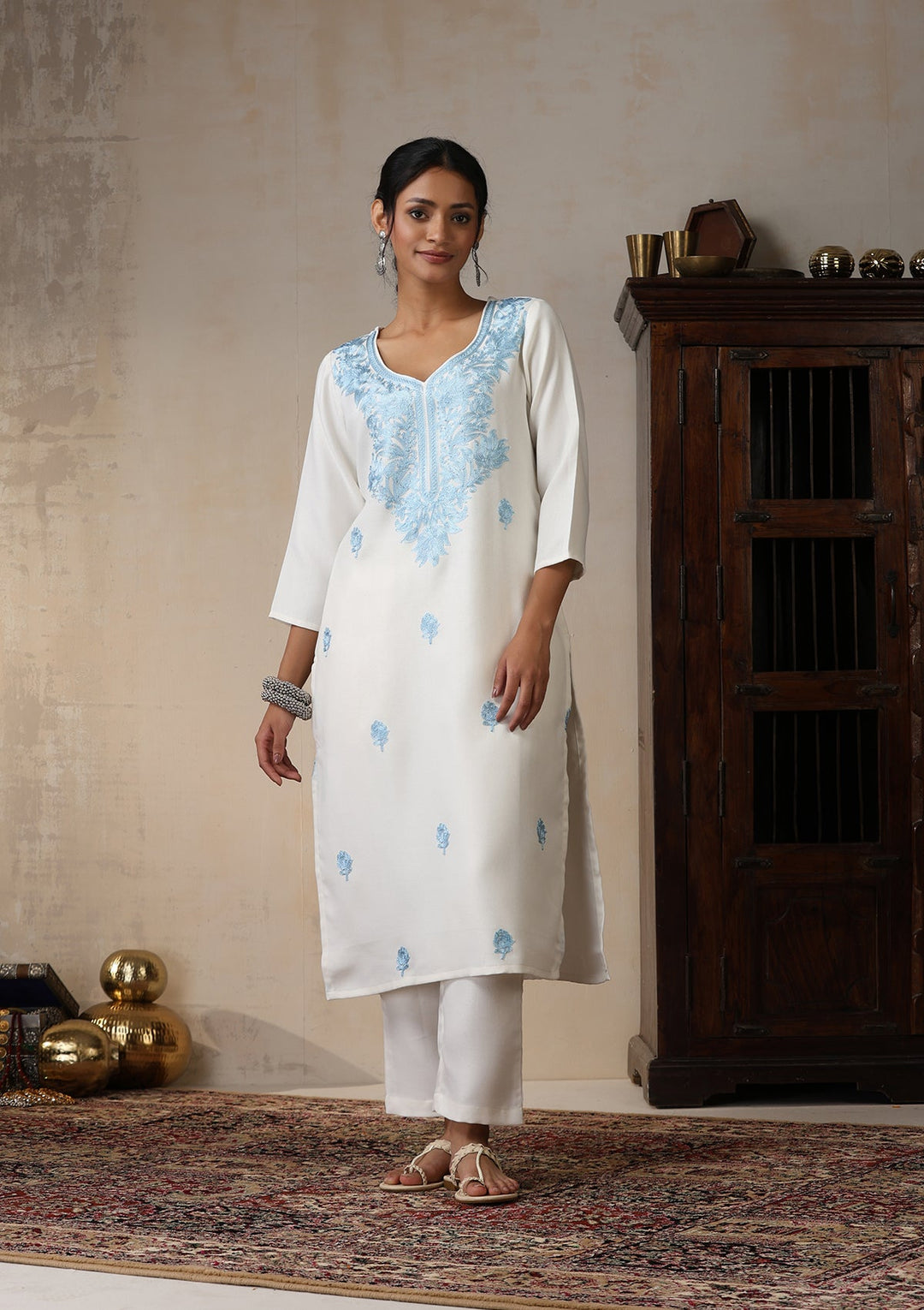 HOC Wool Aari Embroidered Solid Women's 2 Pc Long Kurta Set - White
