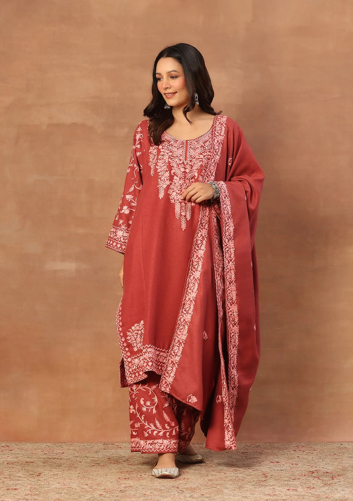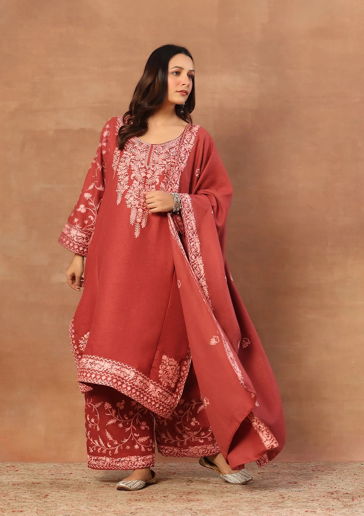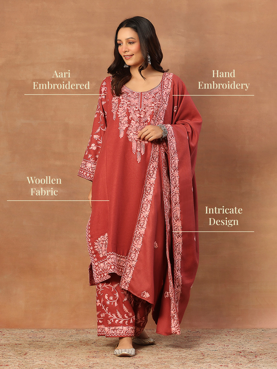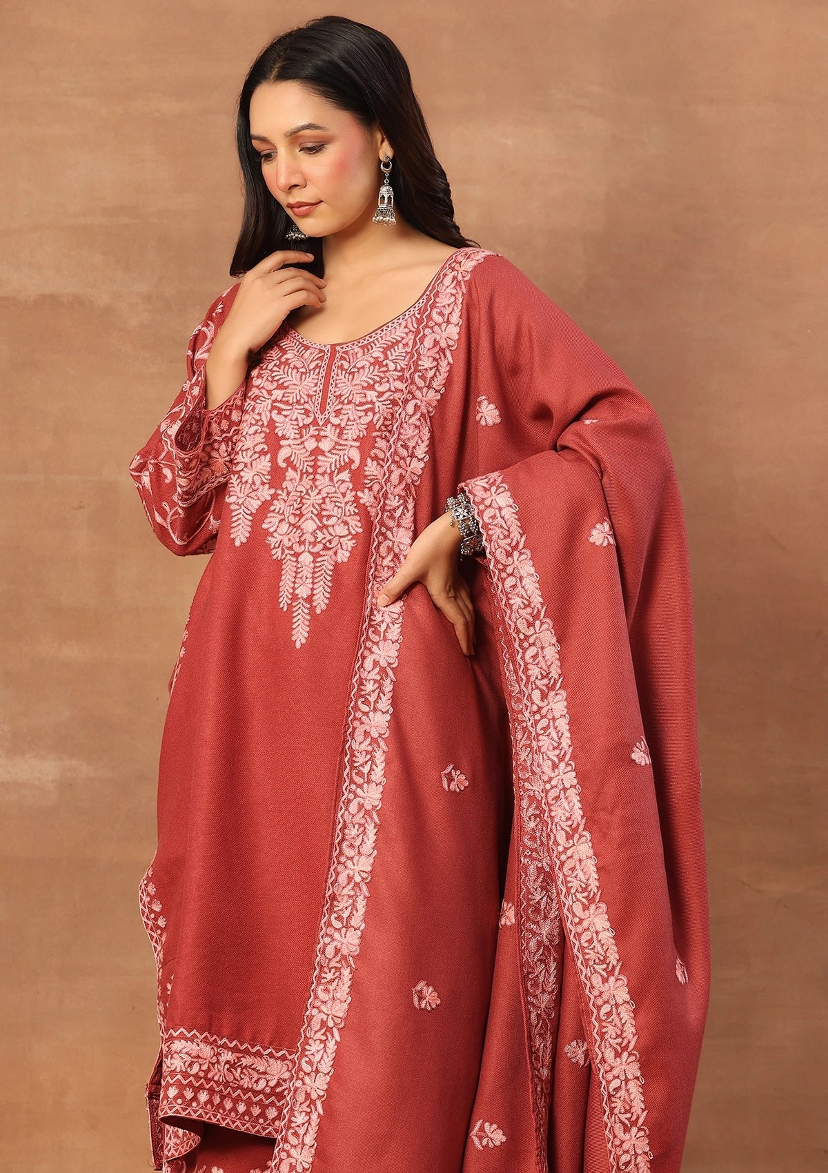 HOC Wool Aari Embroidered Solid Women's 3 Pc Long Phiran Set - Dusty Rose