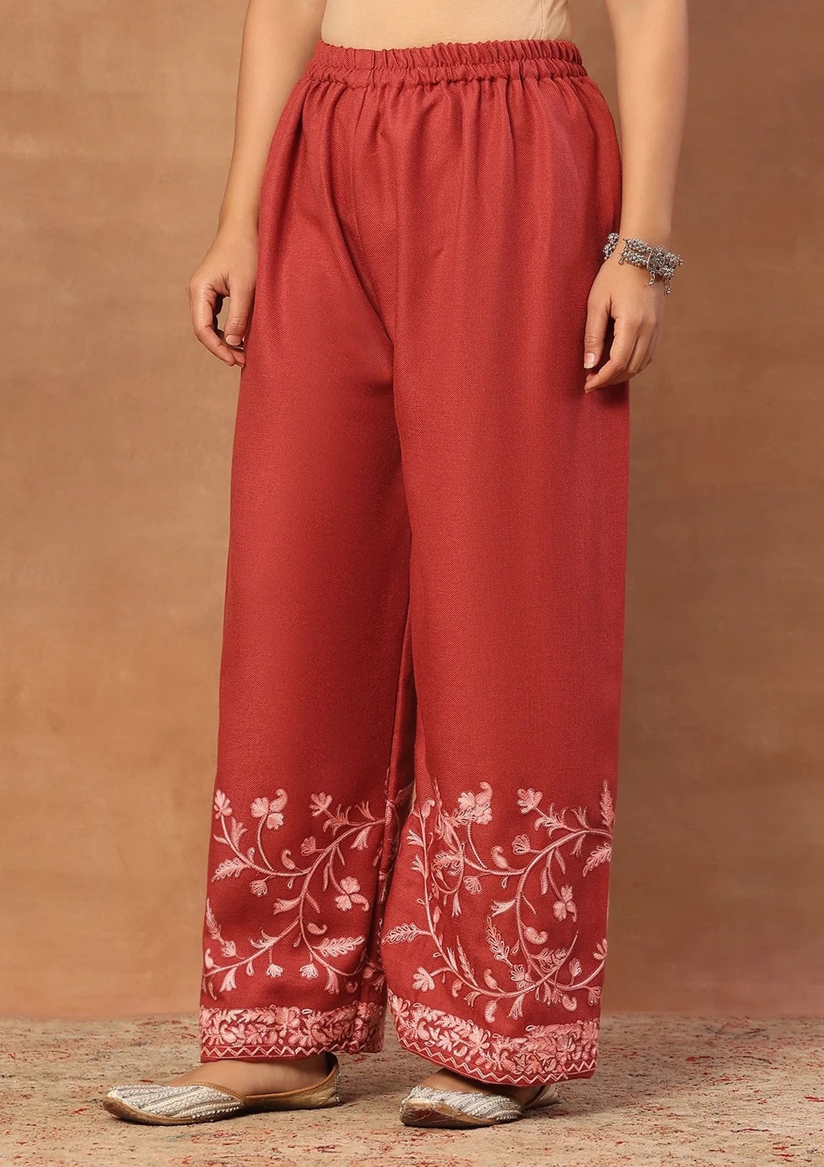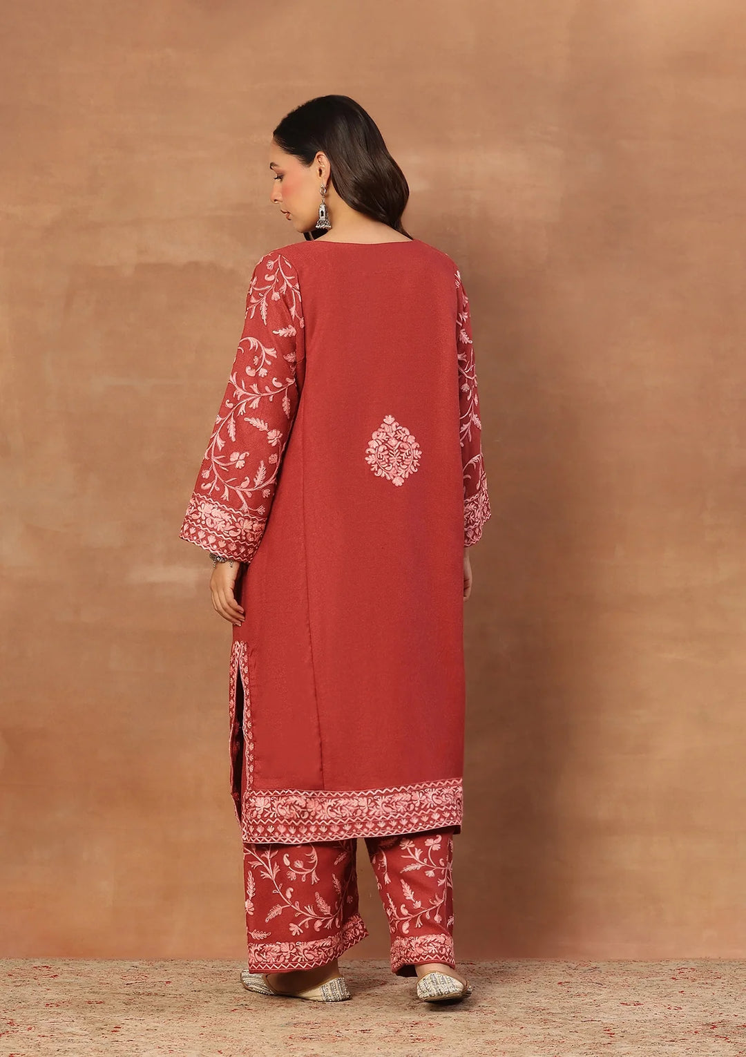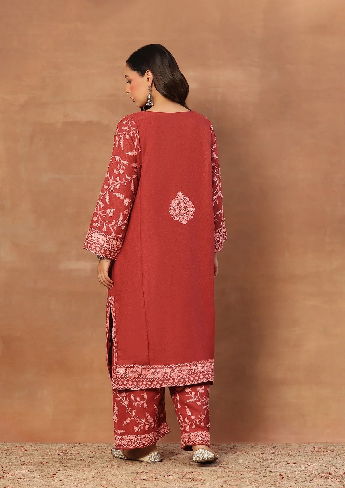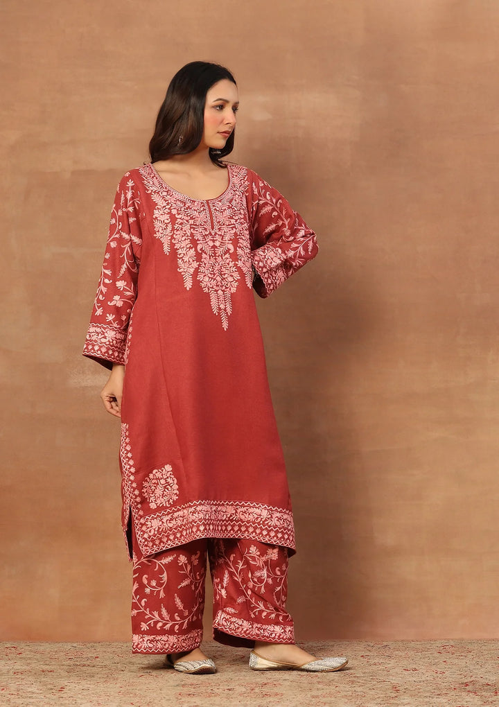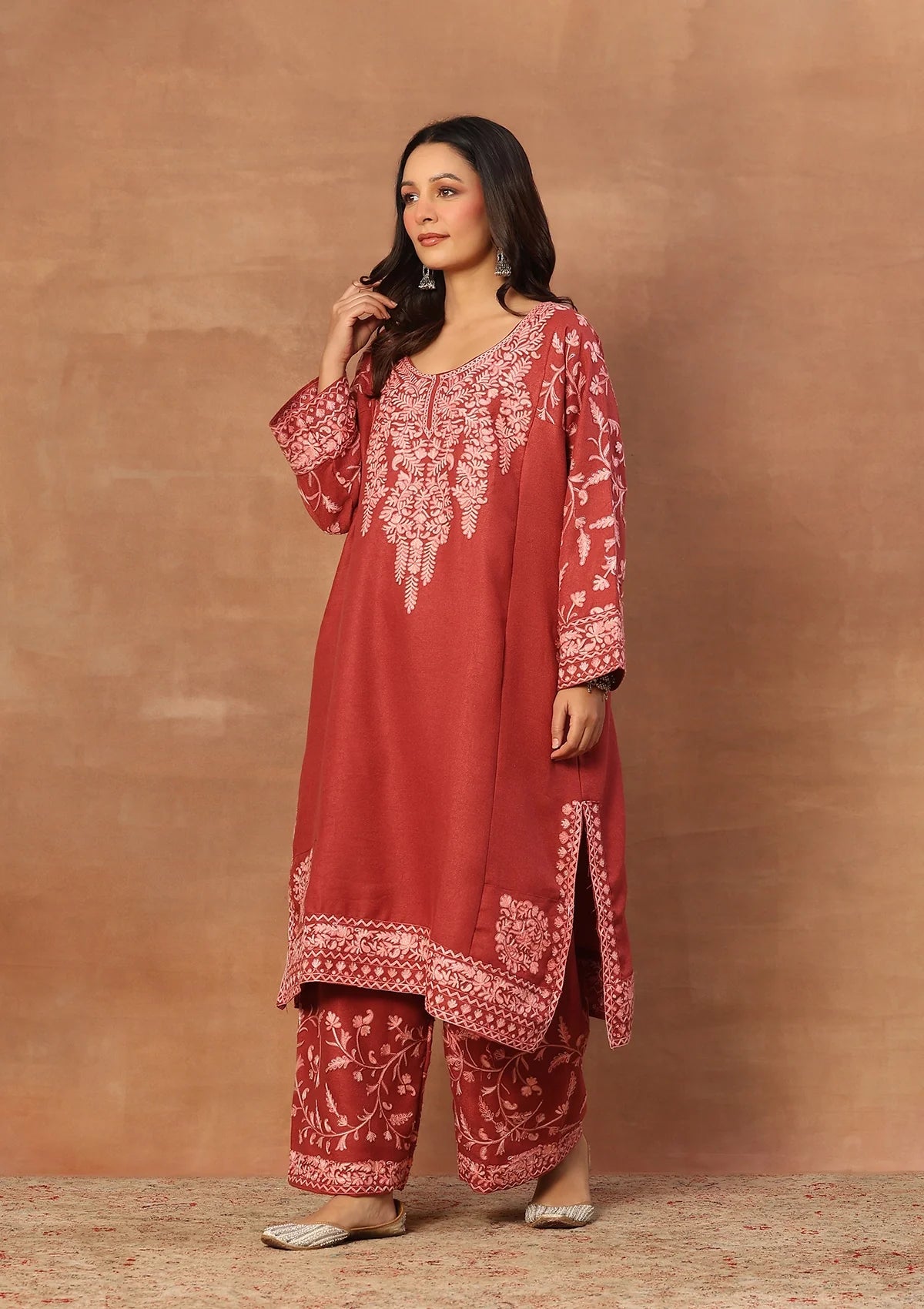 HOC Wool Aari Embroidered Solid Women's 3 Pc Long Phiran Set - Dusty Rose