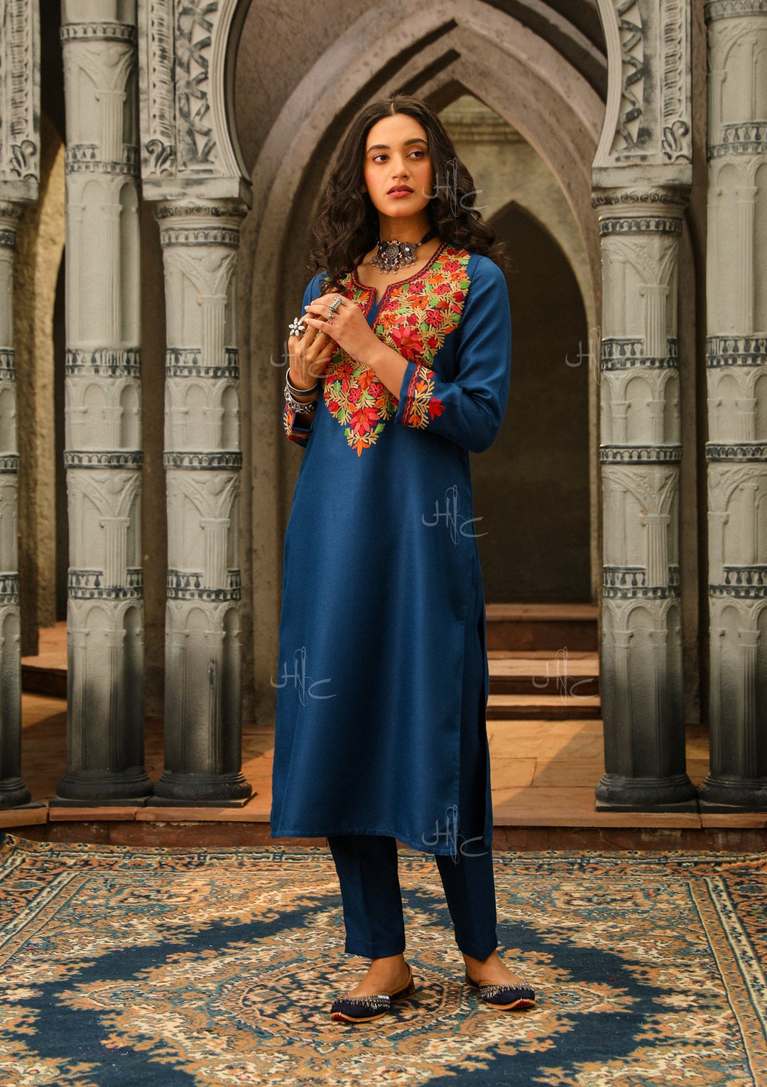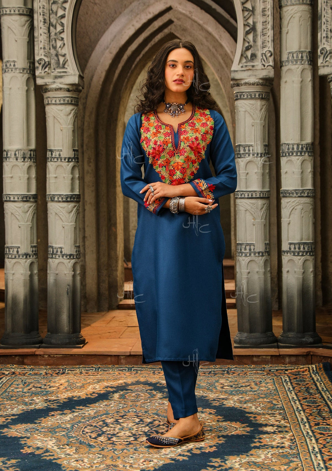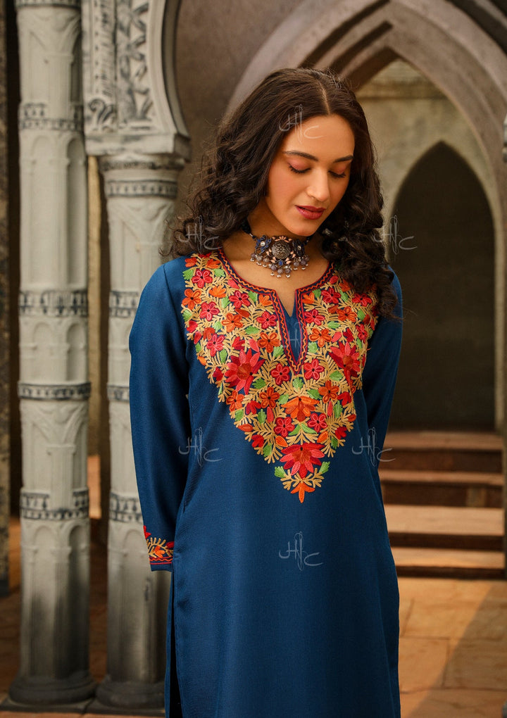 HOC Wool Aari Embroidered Straight Kurta Set- Blue