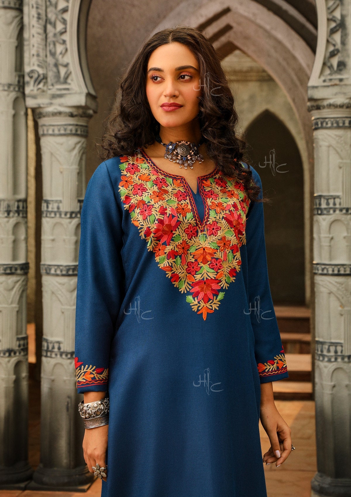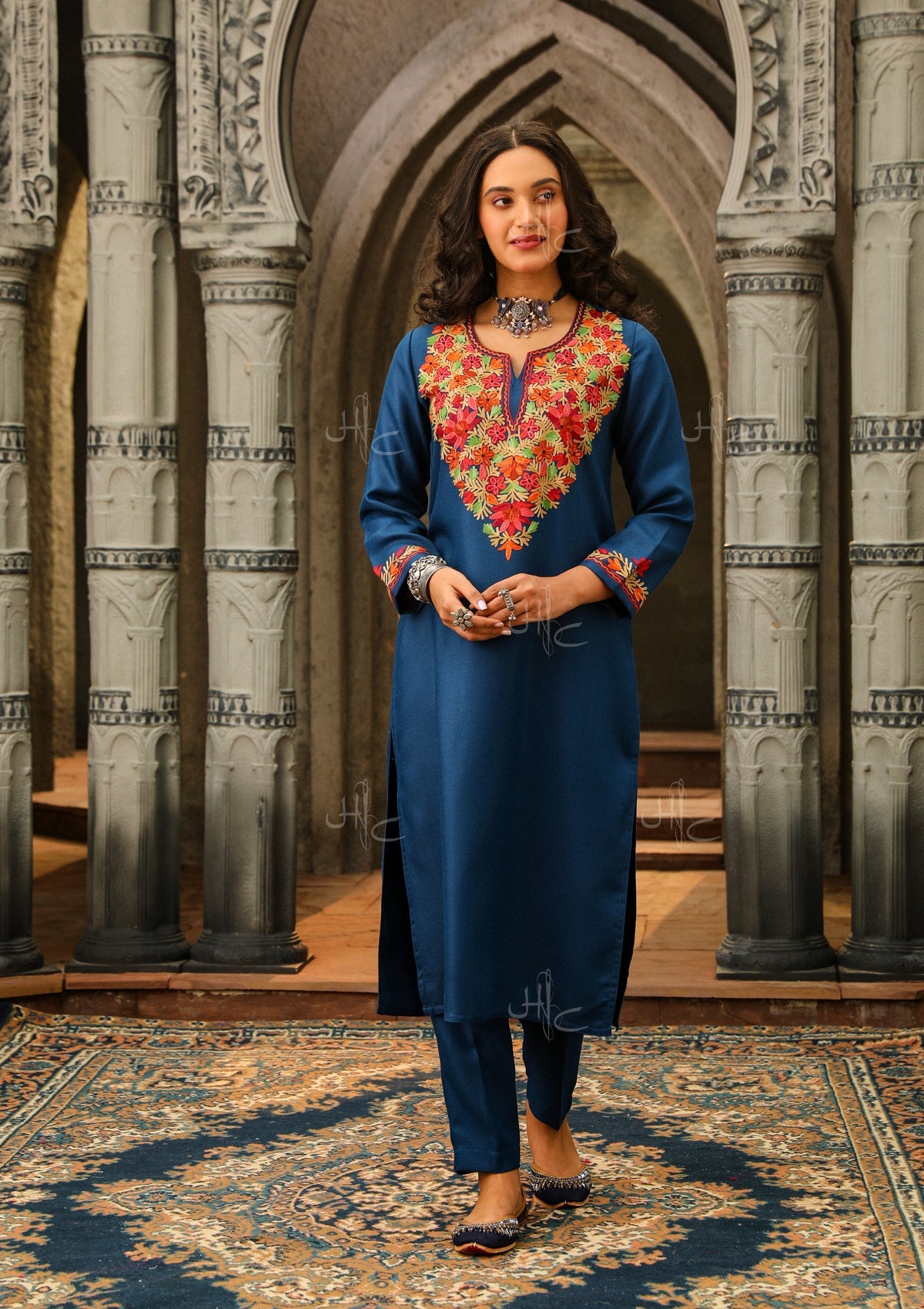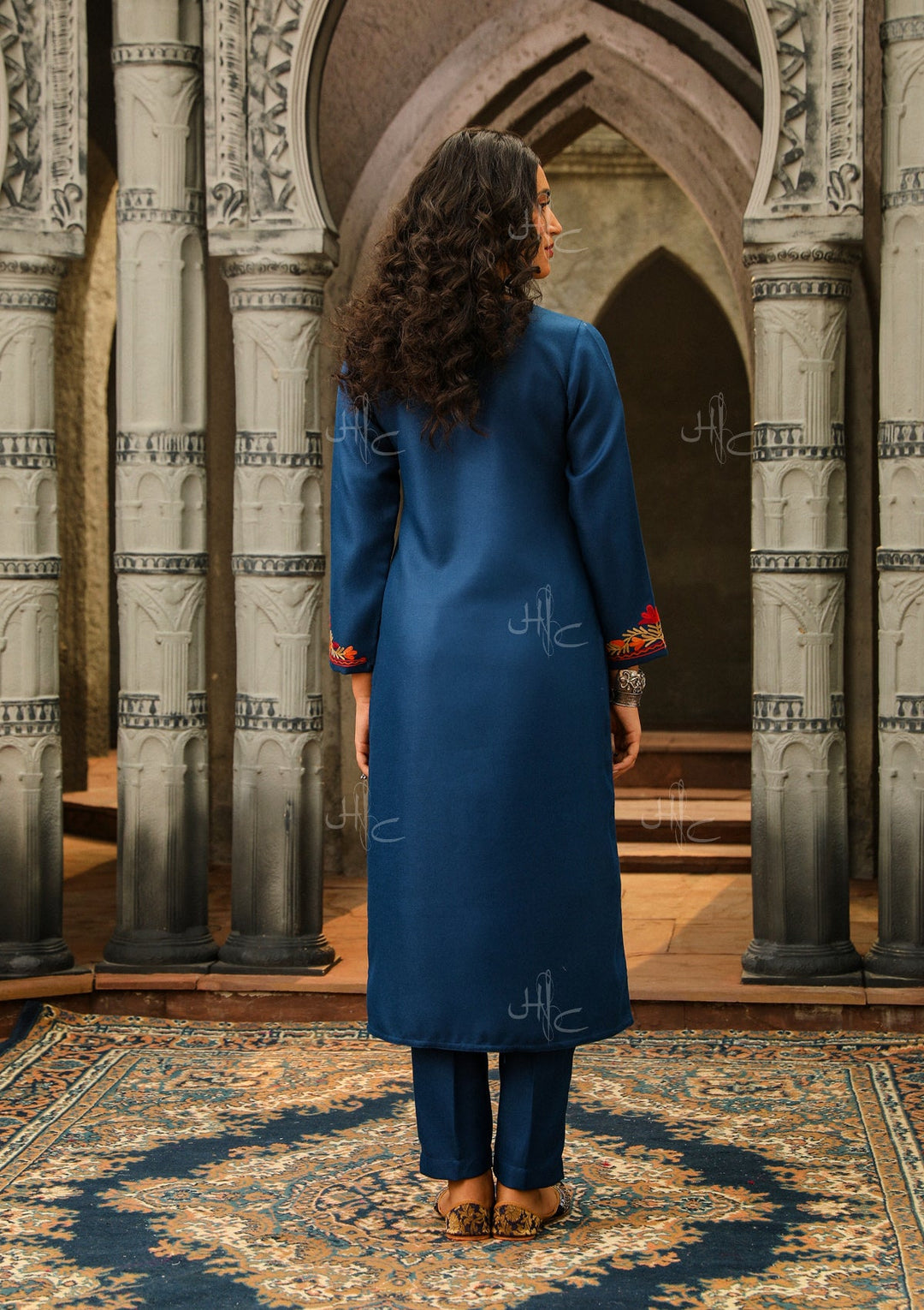HOC Wool Aari Embroidered Straight Kurta Set- Blue
