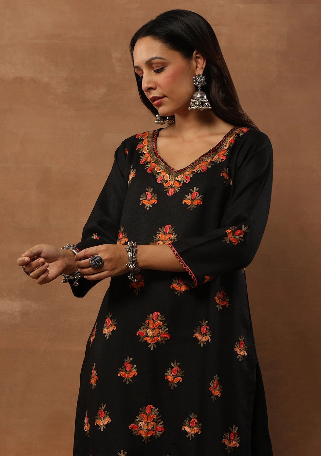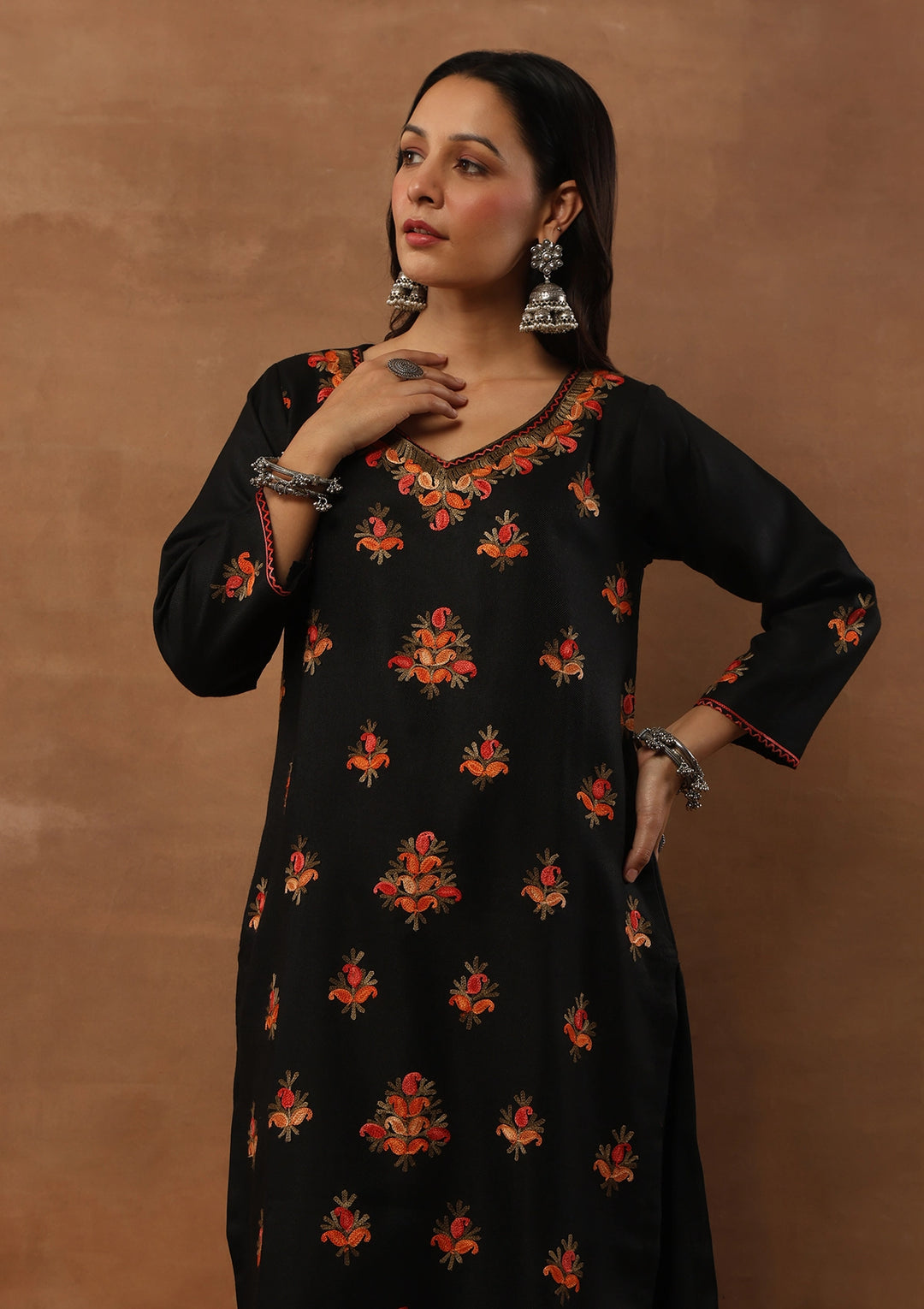 HOC Woollen Aari Embroidered Solid Women's 2 PC Long Kurta Set - Black